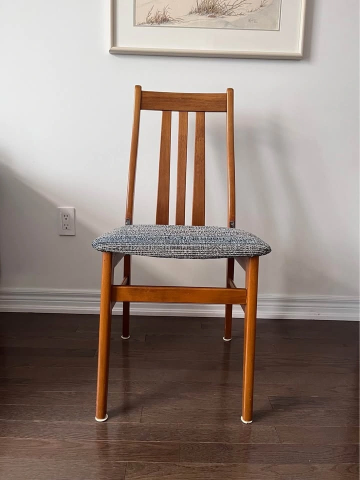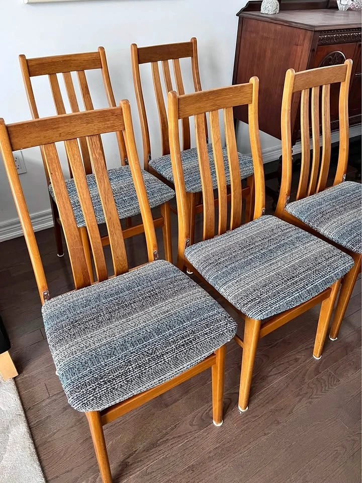 Set of 5 vintage Danish dining chairs by Farstrup. Features a nice curved back and teak and beech frame. Nicely padded seats, newly reupholstered in textured fabric. Metal brackets have been added, which is reflected in the price. Otherwise, in good vintage condition. Chairs are sturdy.