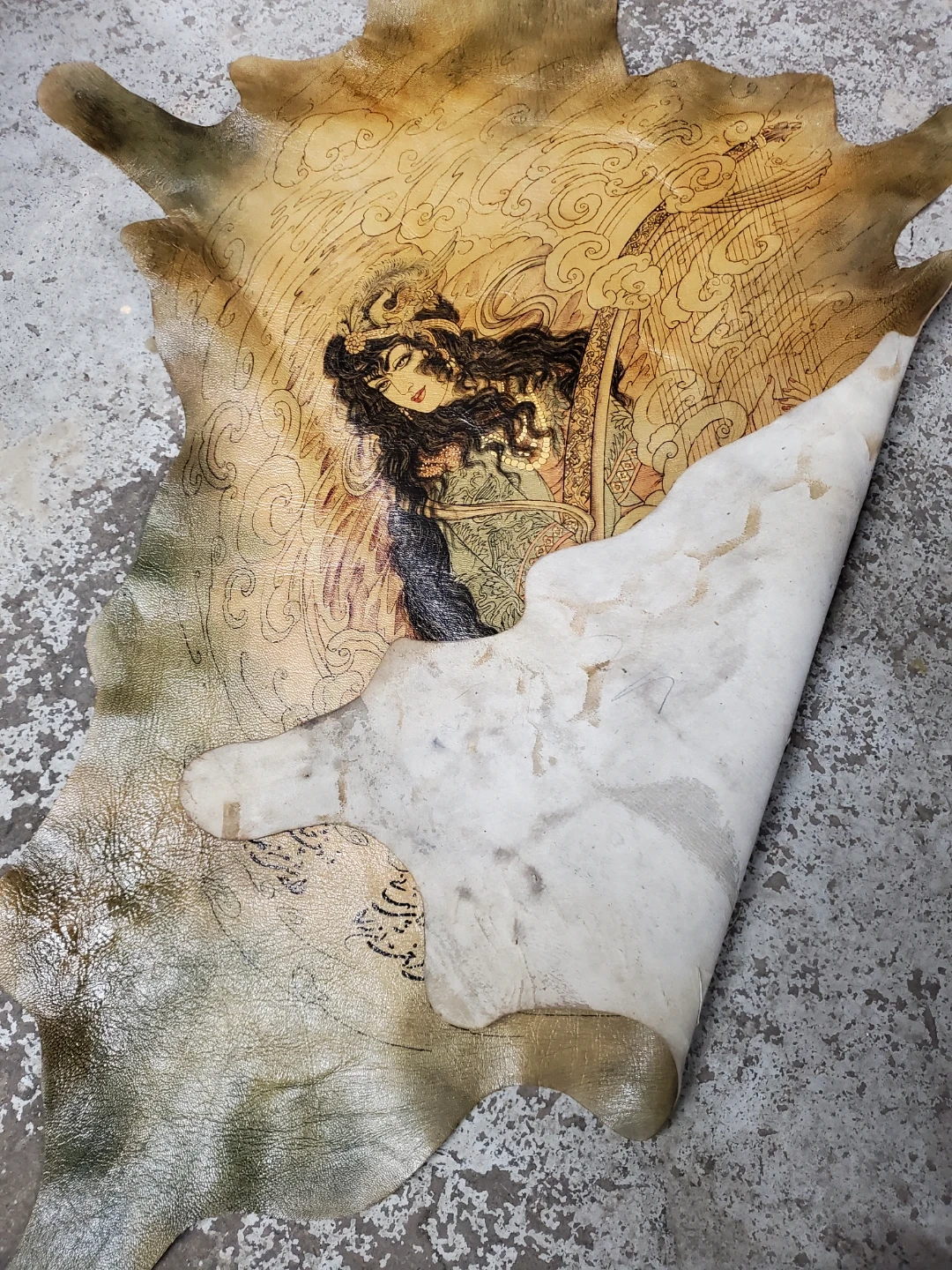 Decorative piece featuring intricate artwork on leather. The design depicts a female figure with detailed linework and shading. This piece would make a unique wall hanging or craft material. Stained on the backside