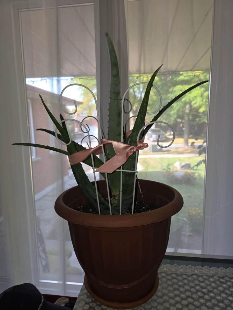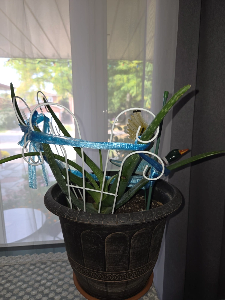 Selling a healthy aloe vera plant in a decorative pot. It comes with a trellis to support its growth. A lovely addition to any home!