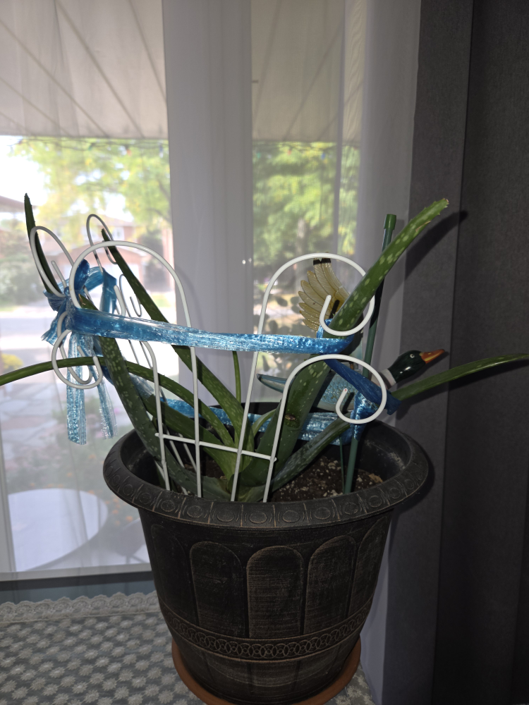 Selling a healthy aloe vera plant in a decorative pot. It comes with a trellis to support its growth. A lovely addition to any home!
