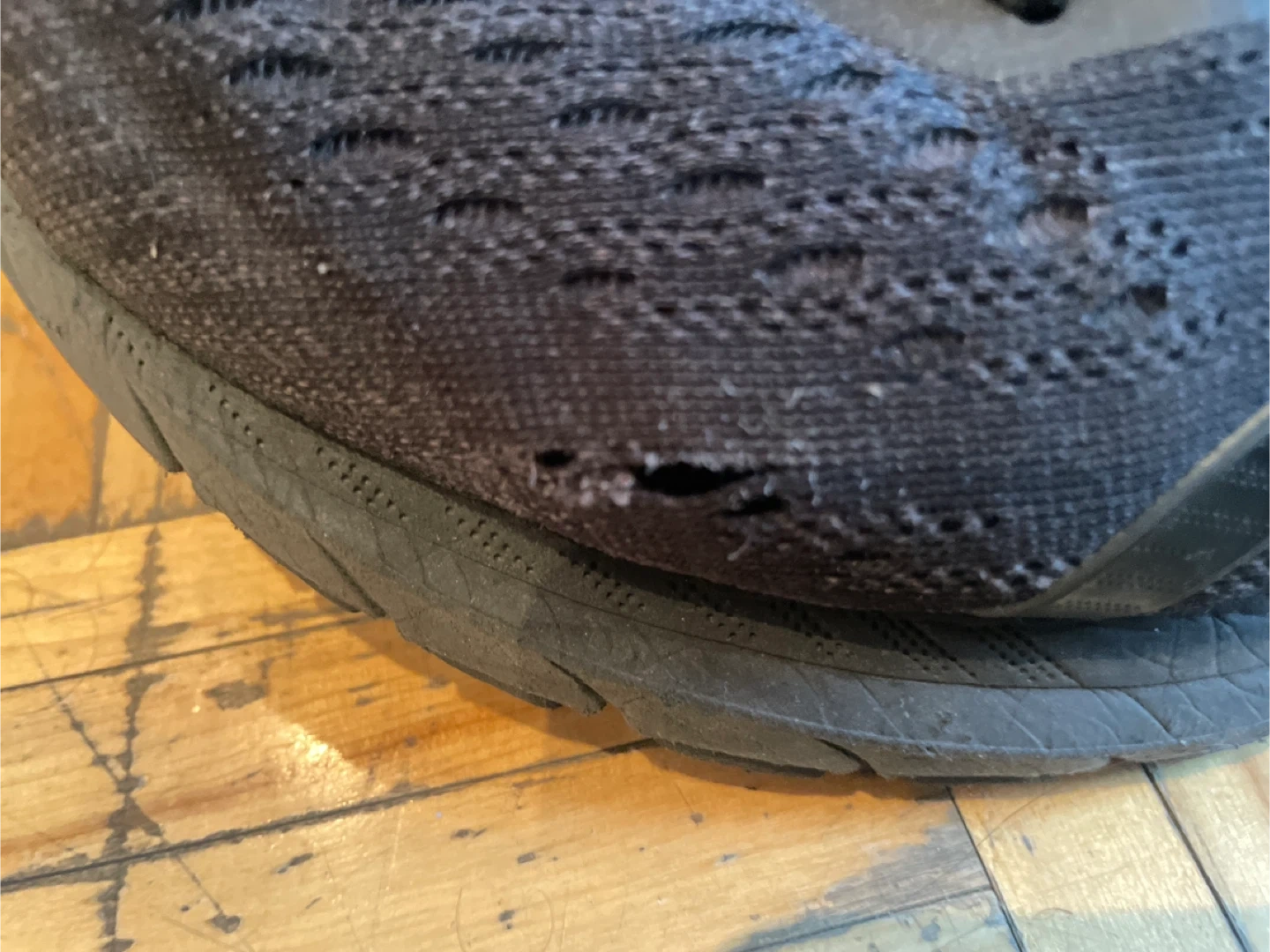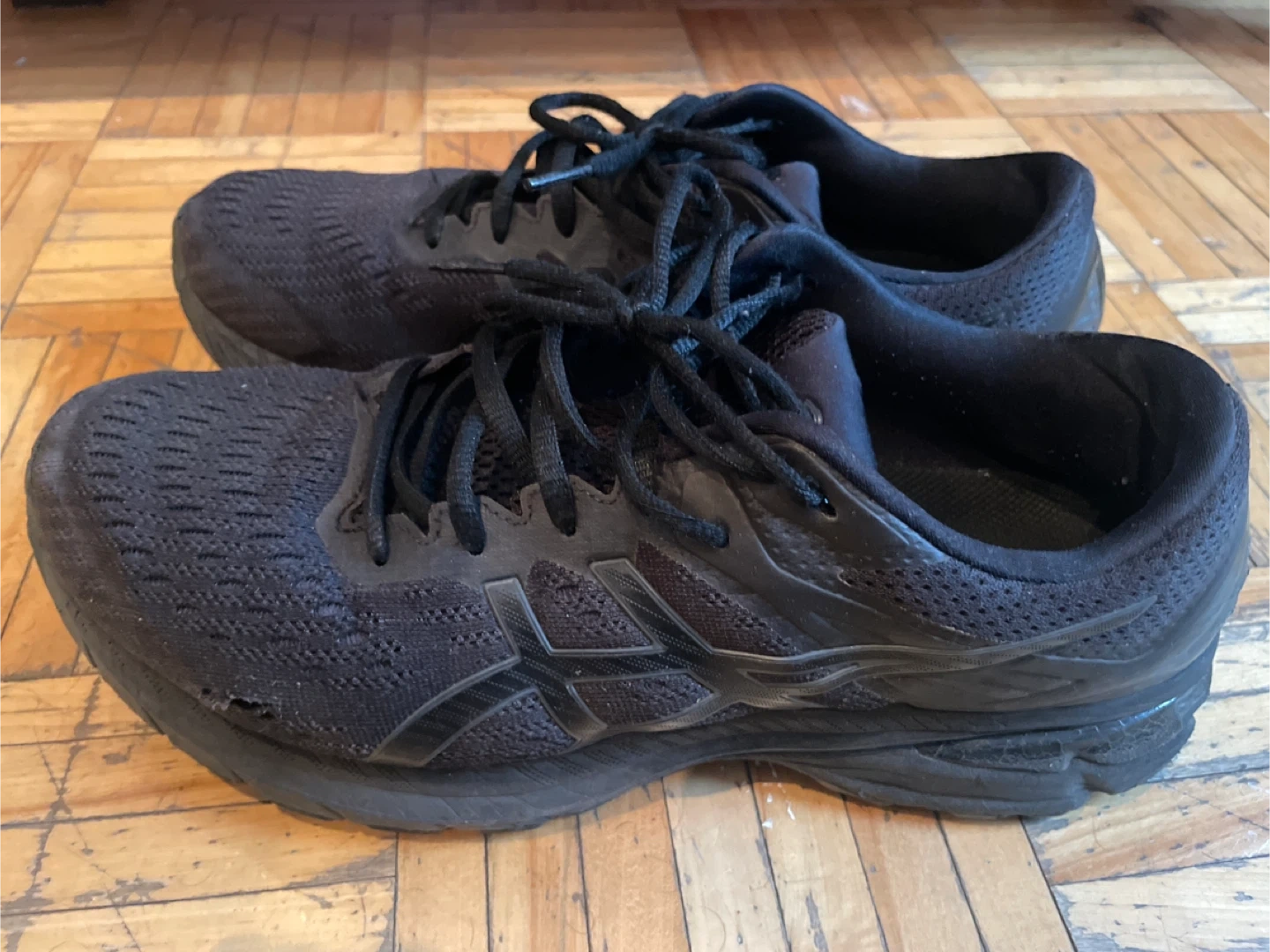 Selling a pair of Asics Gel-Kayano running shoes in black (US 10). The left shoe shows some signs of (reparable) wear, as pictured, but still have plenty of life left for running or everyday use!