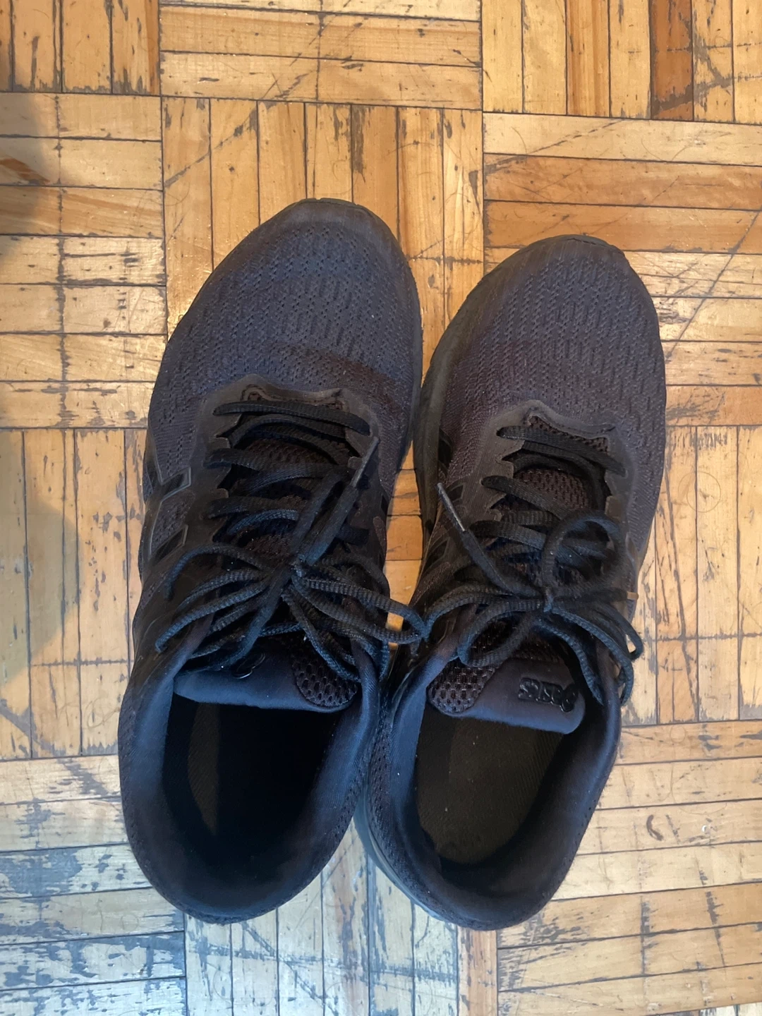 Selling a pair of Asics Gel-Kayano running shoes in black (US 10). The left shoe shows some signs of (reparable) wear, as pictured, but still have plenty of life left for running or everyday use!