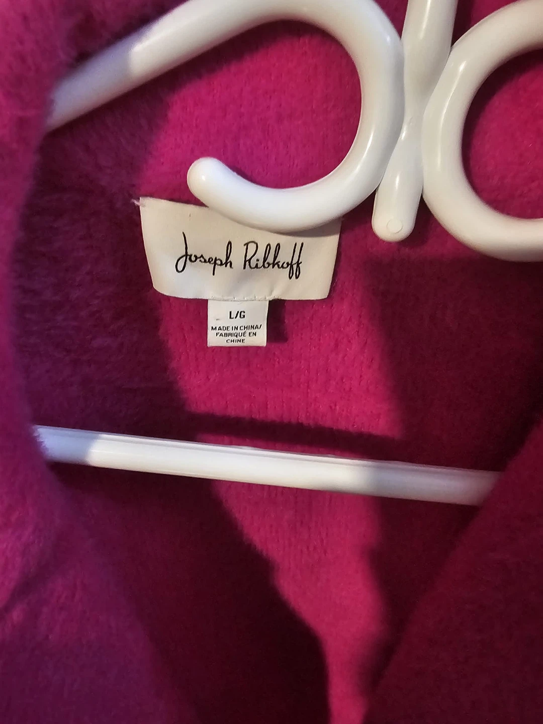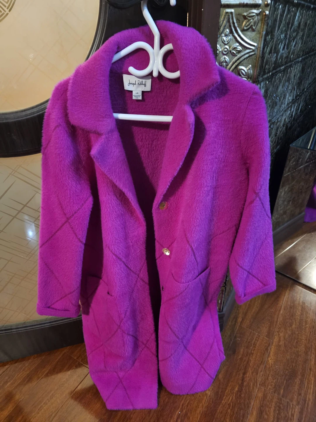 Joseph Ribkoff fuzzy coat in a vibrant pink colour. Features a classic lapel and button front closure. Made of a soft, fuzzy material. Size L/G.