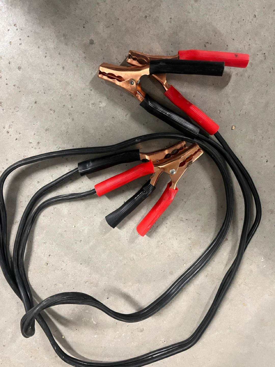 Standard jumper cables for vehicles. Features copper clamps for good conductivity. Essential for any car emergency kit!