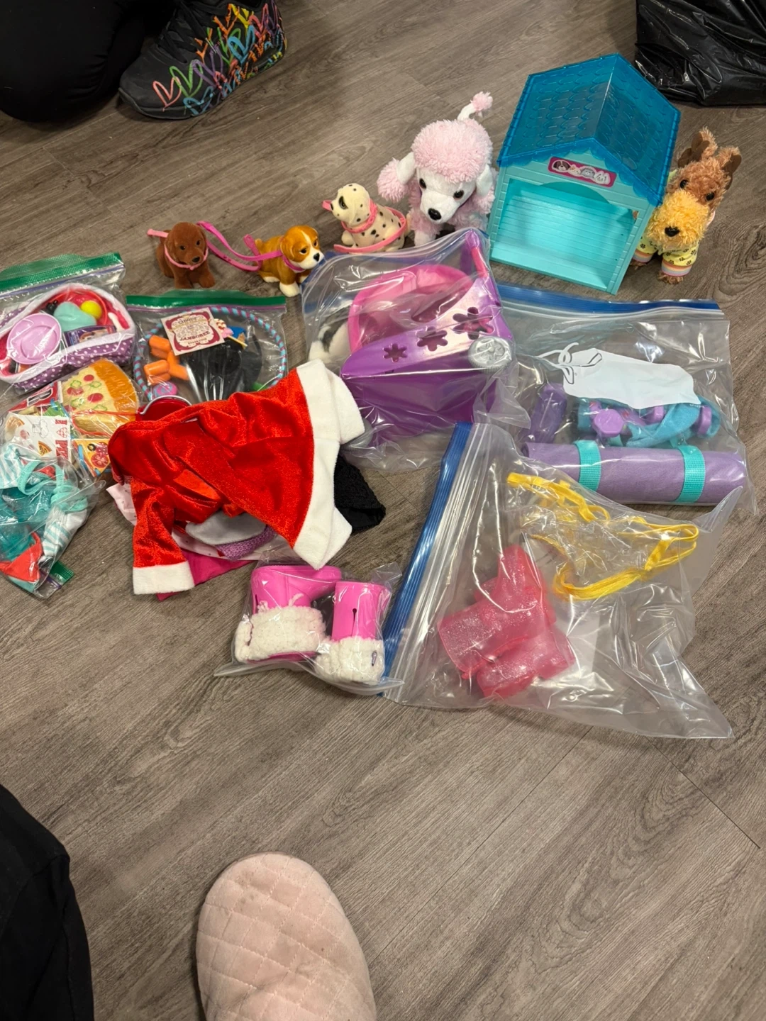 A collection of doll accessories including clothing, a dog house, and plush dogs. Many pieces are packaged separately. These are fun additions for doll play!