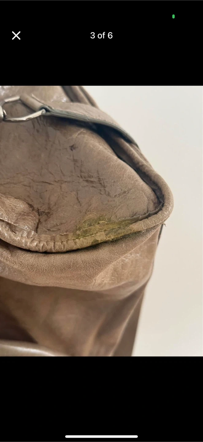 Taupe distressed leather Balenciaga Paris handbag. Features double top handles and a removable shoulder strap. Minor flaw on the edge and one of the zippers is missing tab but not noticeable