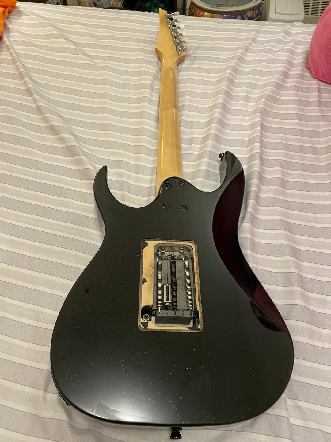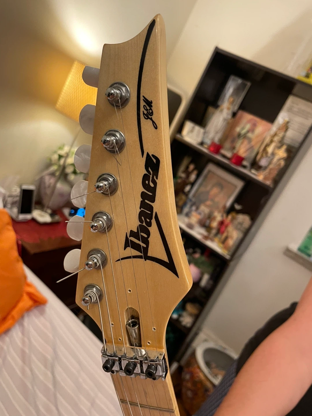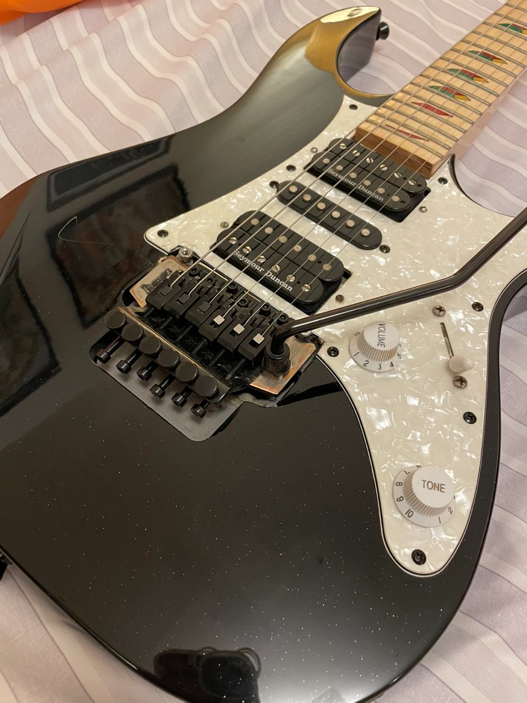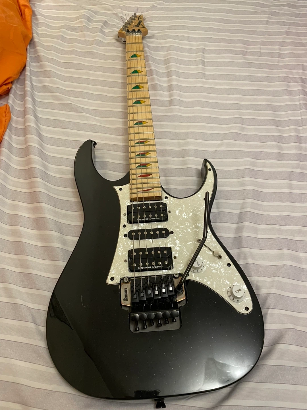 Selling an Ibanez JEM 6-String electric guitar in black! It's in good condition and ready for a new home. The guitar features a distinctive white pickguard and the iconic Ibanez headstock design. Perfect for any guitar enthusiast! With guitar bag