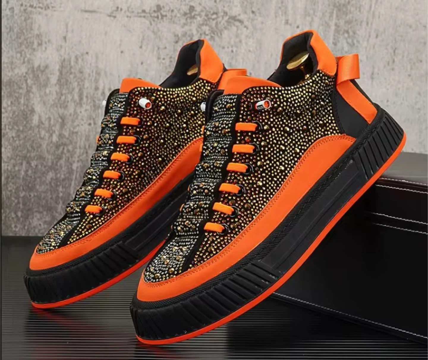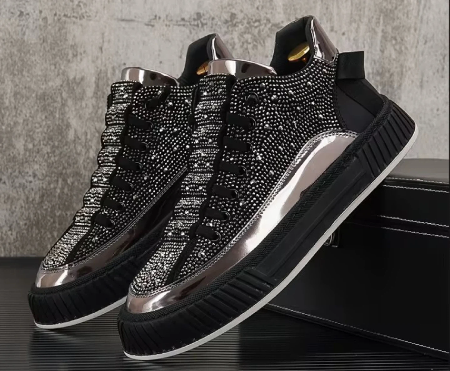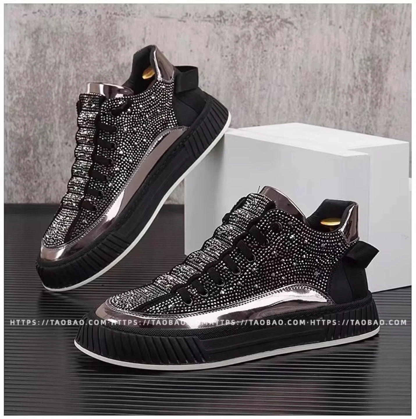 Stylish high-top sneakers adorned with sparkling rhinestones and metallic accents. These shoes feature a durable rubber sole and secure lace-up closure. A bold statement piece for any casual outfit!