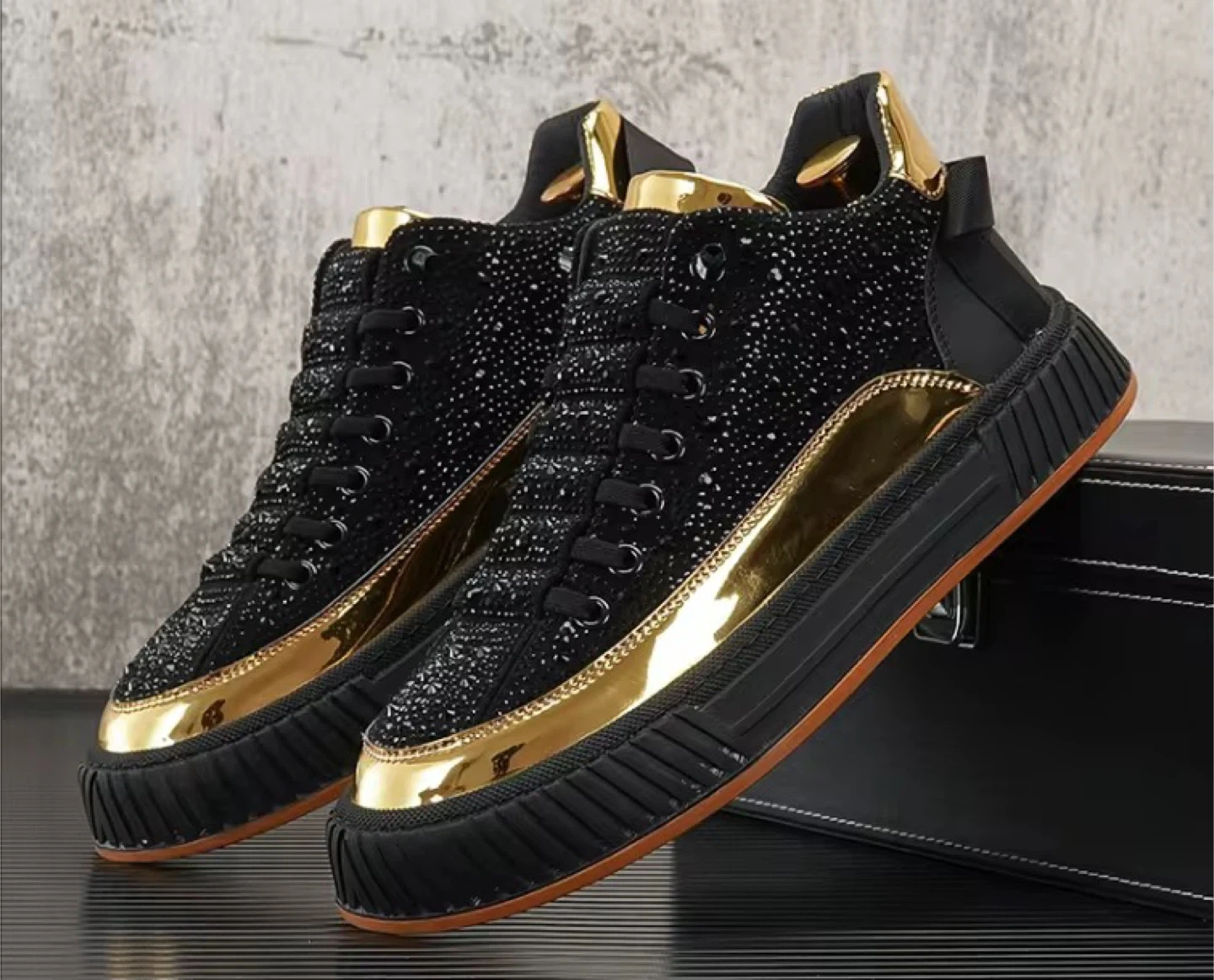 Stylish high-top sneakers adorned with sparkling rhinestones and metallic accents. These shoes feature a durable rubber sole and secure lace-up closure. A bold statement piece for any casual outfit!