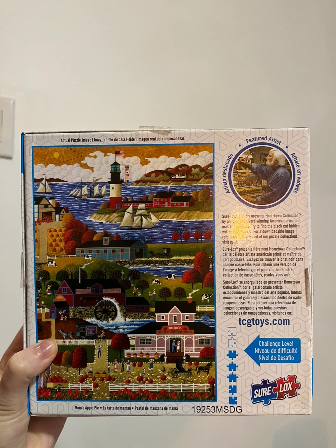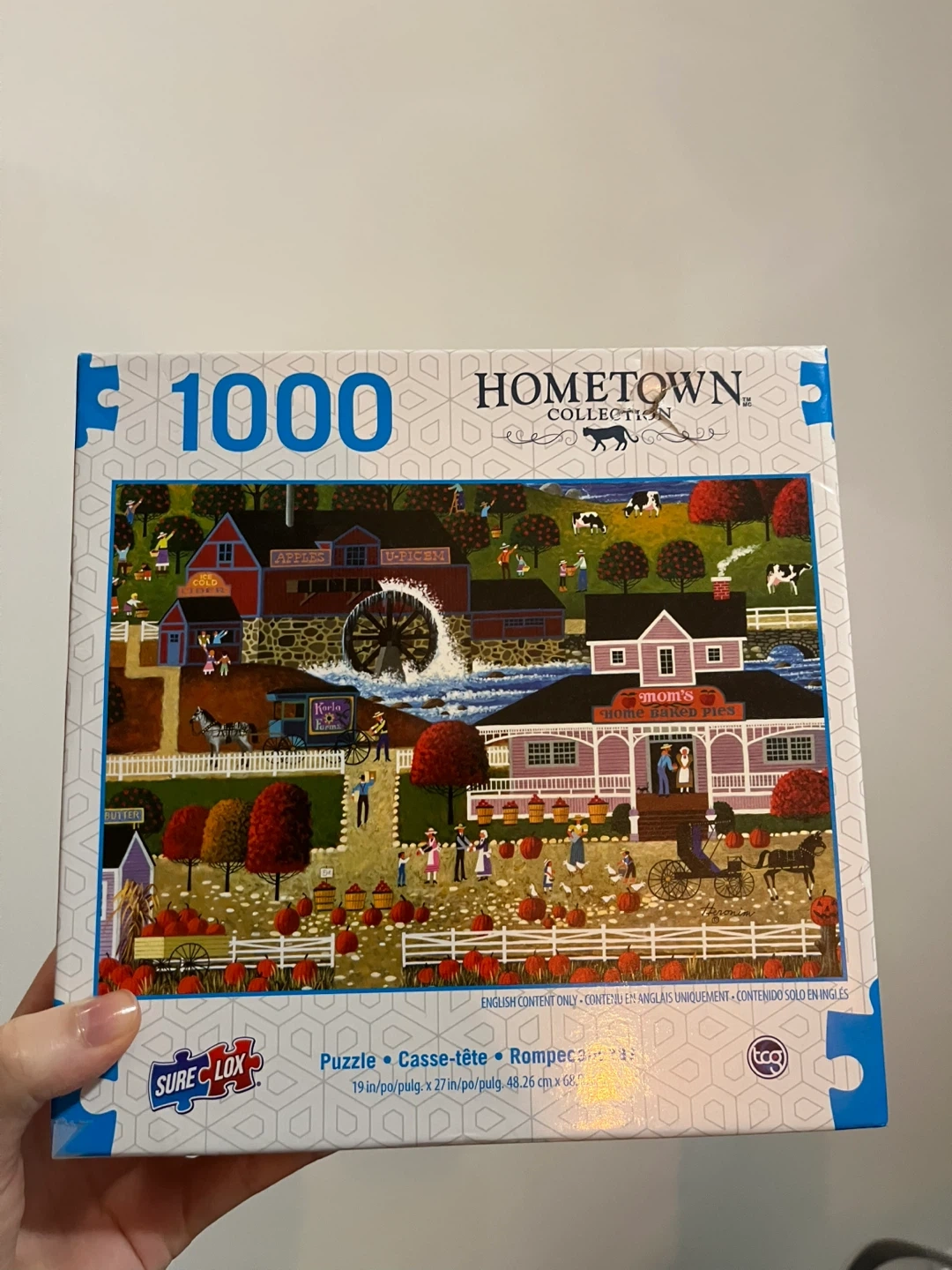 This Hometown Collection puzzle features a charming autumn scene with a village, farm, and pumpkins. It's a 1000-piece jigsaw puzzle. The completed puzzle measures 19 in. x 27 in.