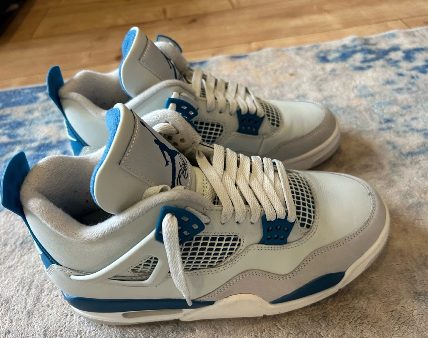 These Air Jordan 4 Retro sneakers come in a clean white and racer blue colourway. They feature the iconic Jumpman logo and Flight text on the tongue. Leather and mesh upper with rubber sole.