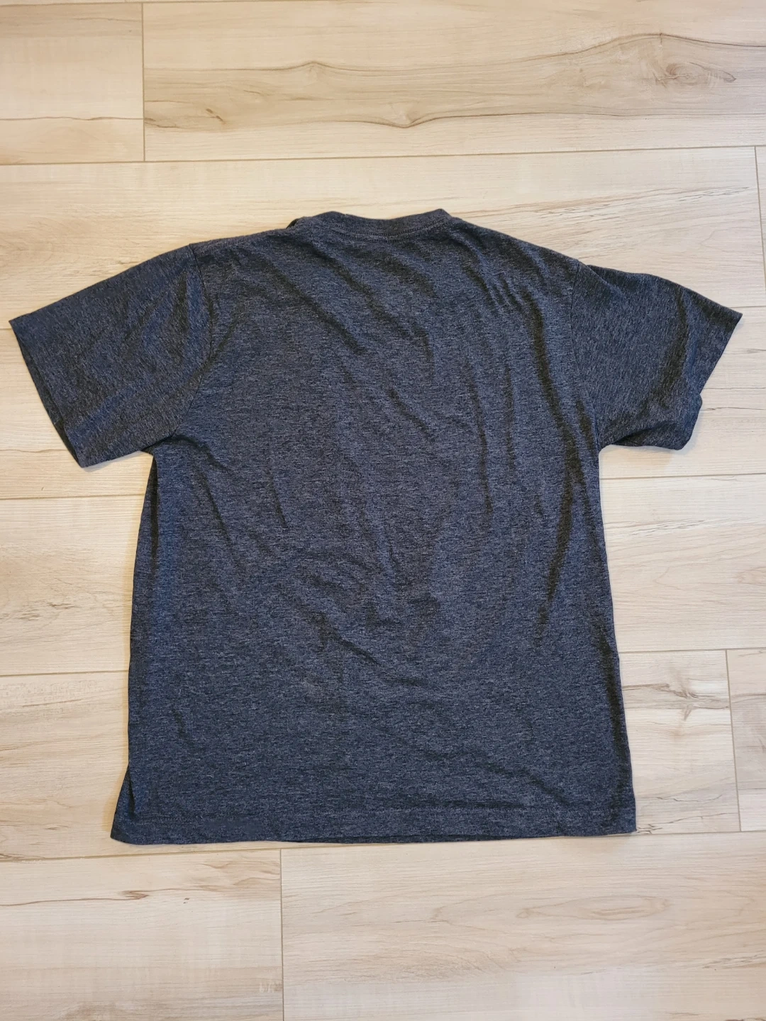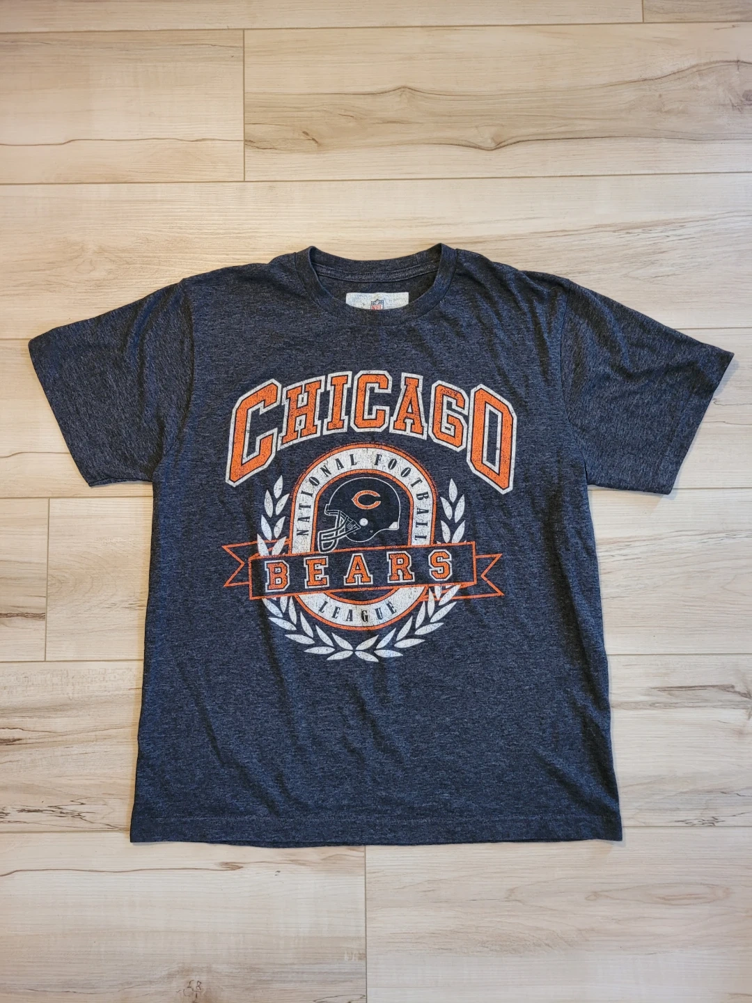 This is a charcoal gray short-sleeve t-shirt with stylish worn look logo. It's made of 50% cotton and 50% polyester. Features the Chicago Bears logo and NFL branding. Size is medium.