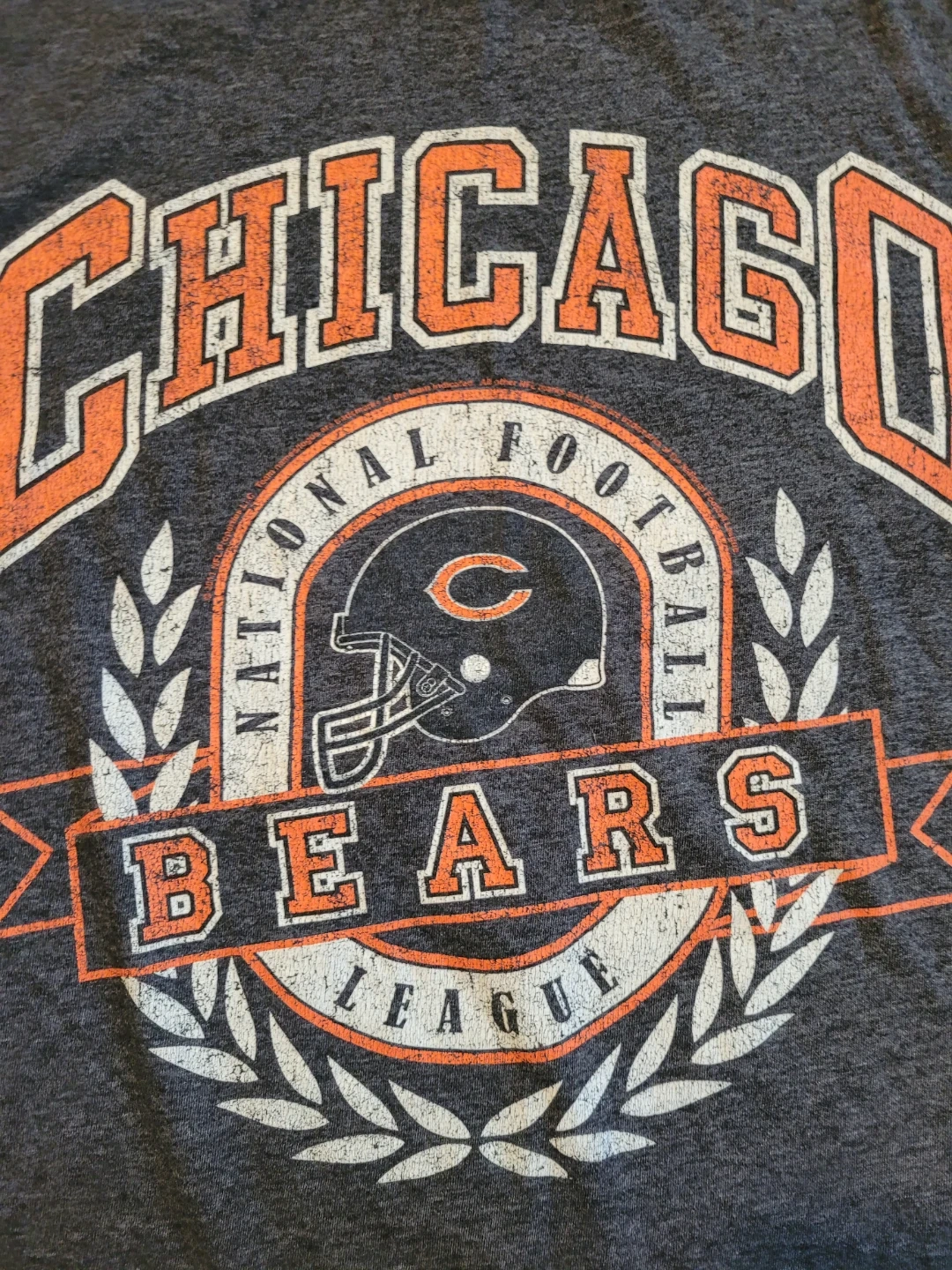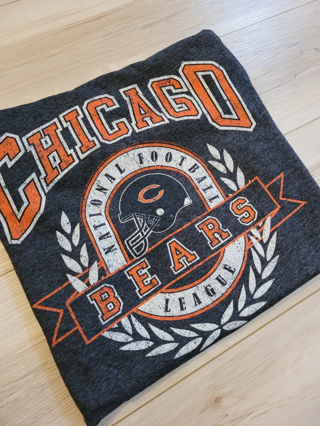 This is a charcoal gray short-sleeve t-shirt with stylish worn look logo. It's made of 50% cotton and 50% polyester. Features the Chicago Bears logo and NFL branding. Size is medium.
