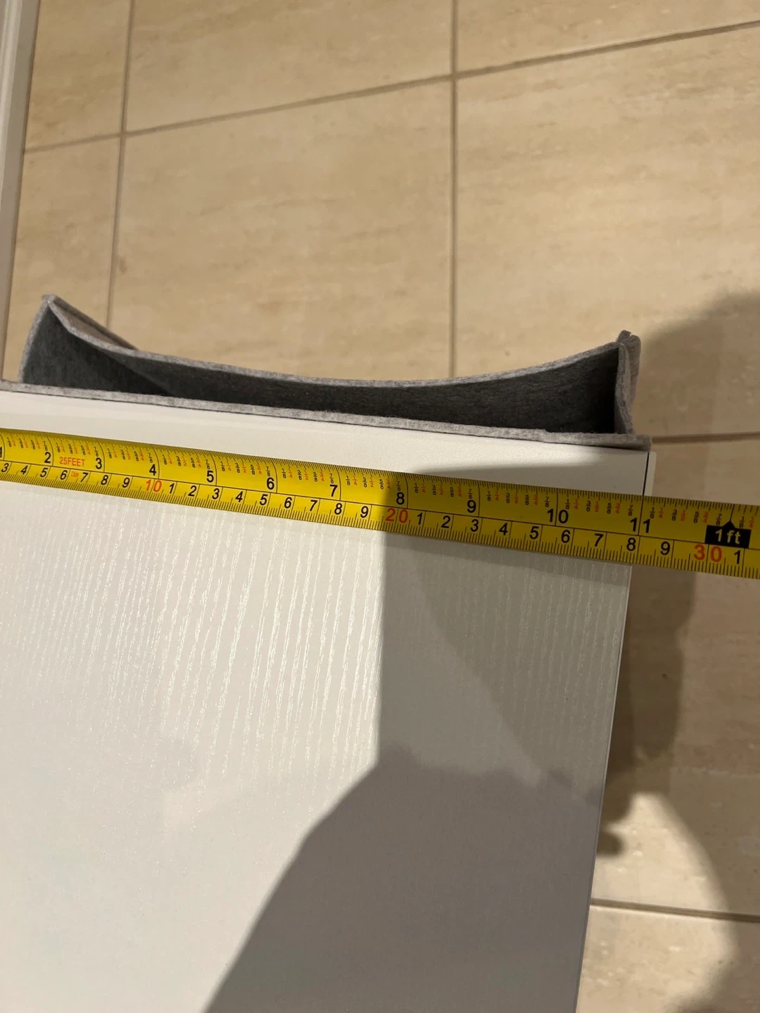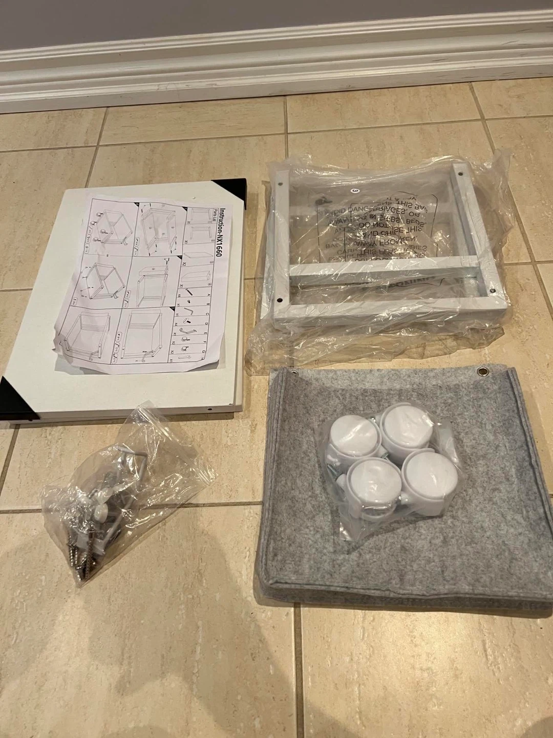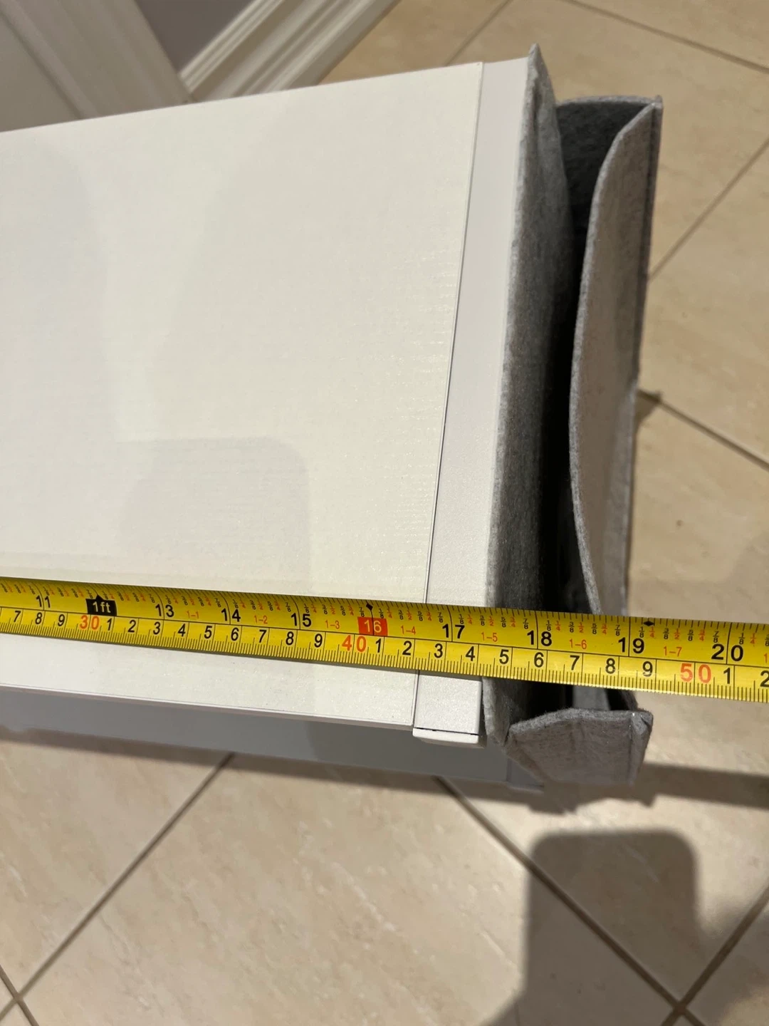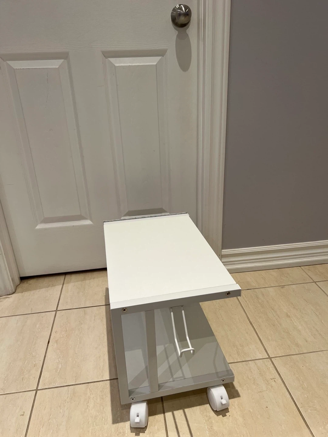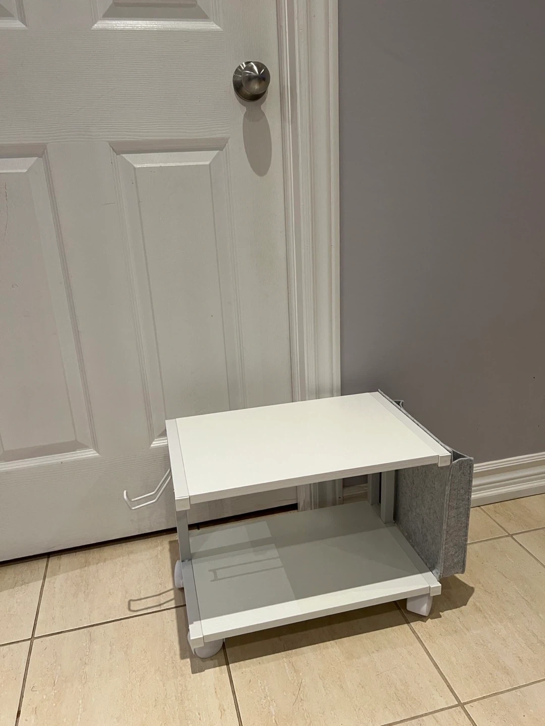 A handy white 2-tier rolling cart with a grey felt storage bag attached. It's perfect for organizing office supplies or small electronics. The cart features wheels for easy mobility.
