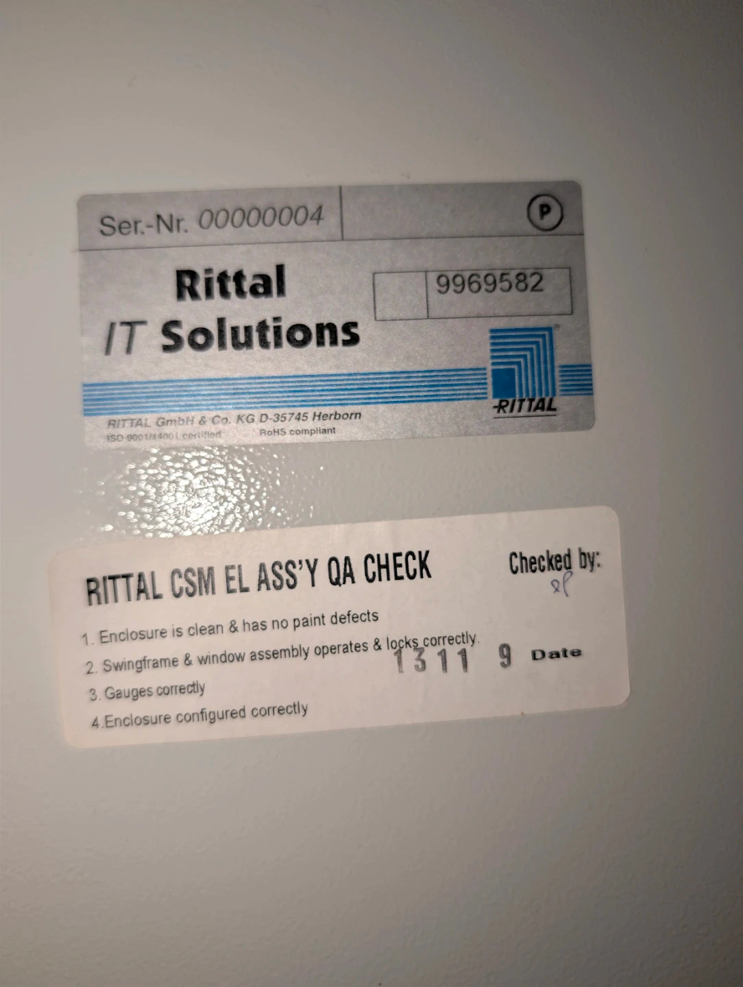 This enclosure is in phenomenal, near-new condition. The glass is pristine, and the interior still retains the original factory "RITTAL CSM EL ASS'Y QA CHECK" stickers.