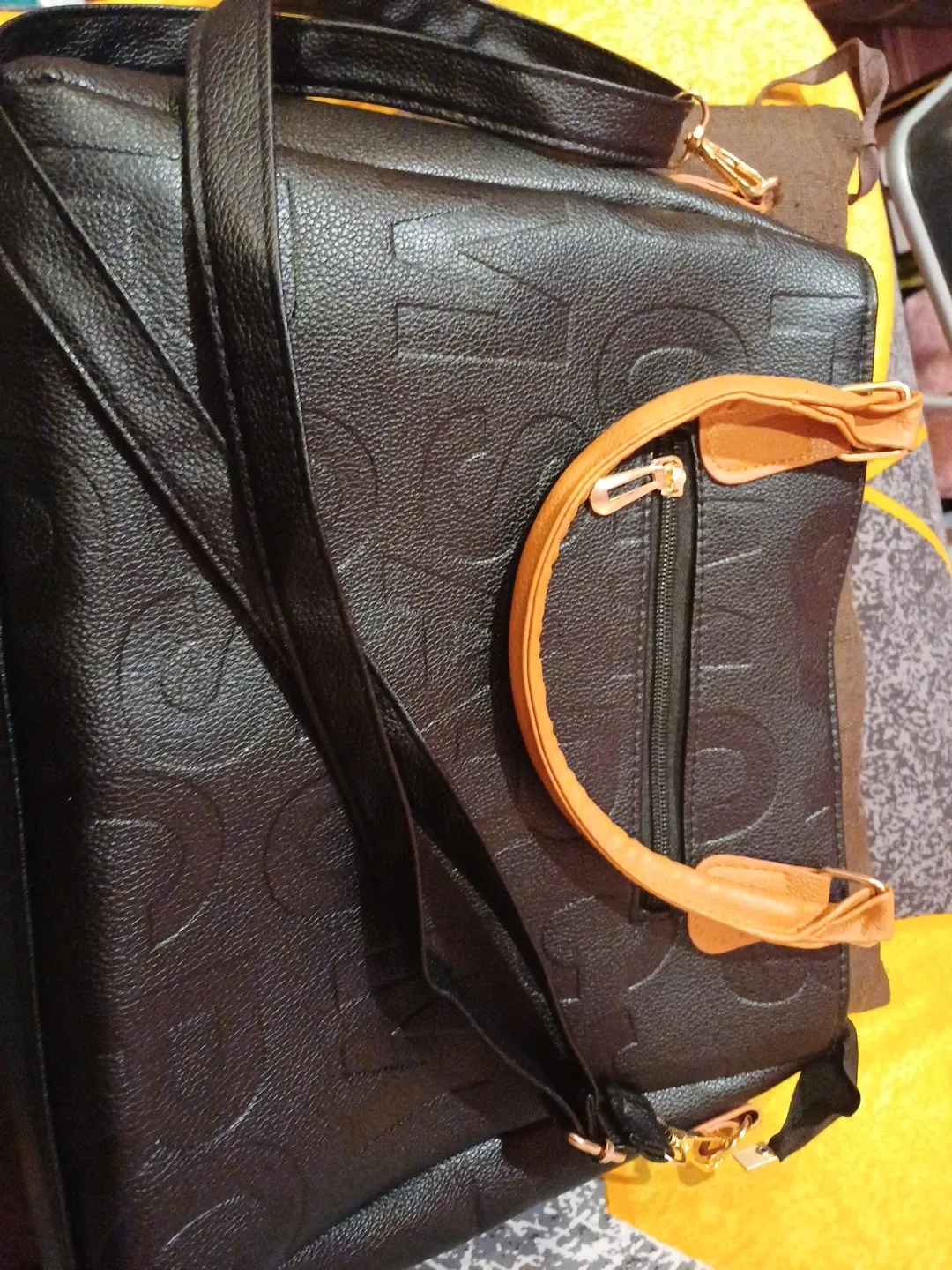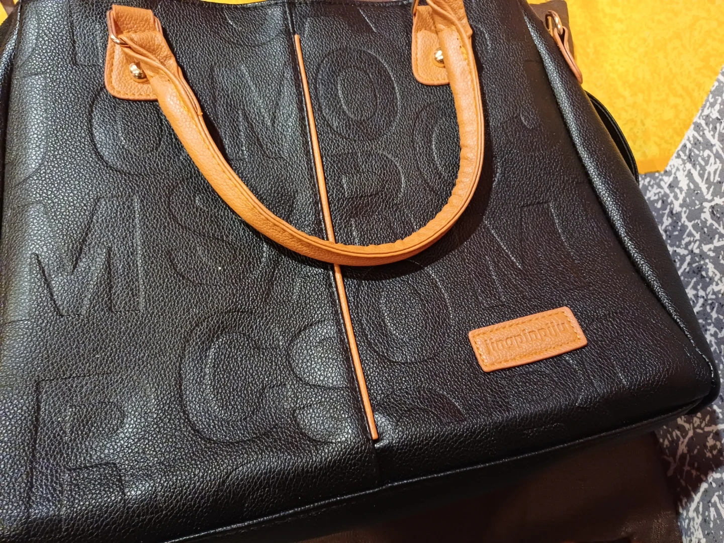 Stylish black tote bag with a shoulder strap! It features a unique embossed letter design and tan handles. Perfect for everyday use