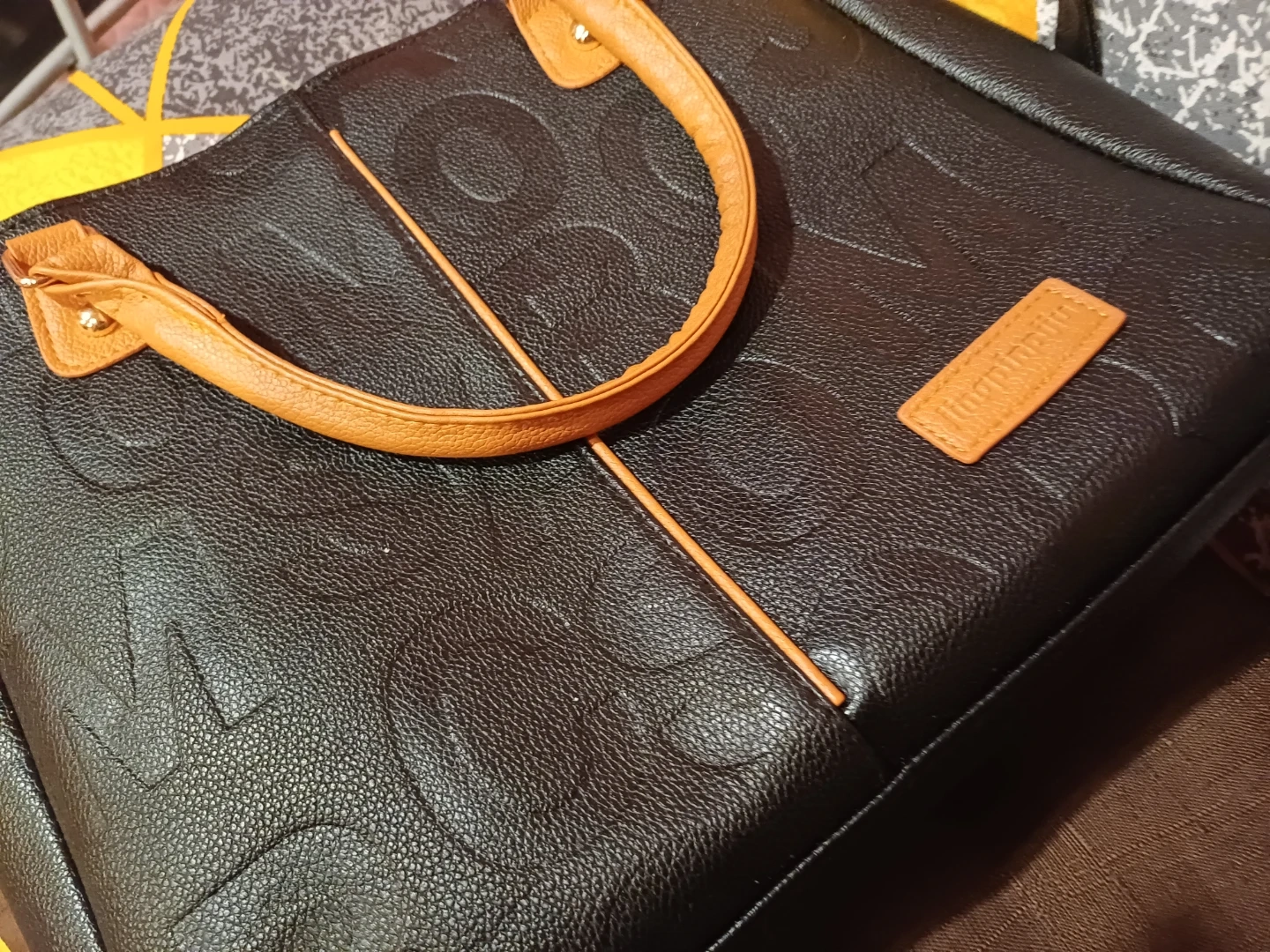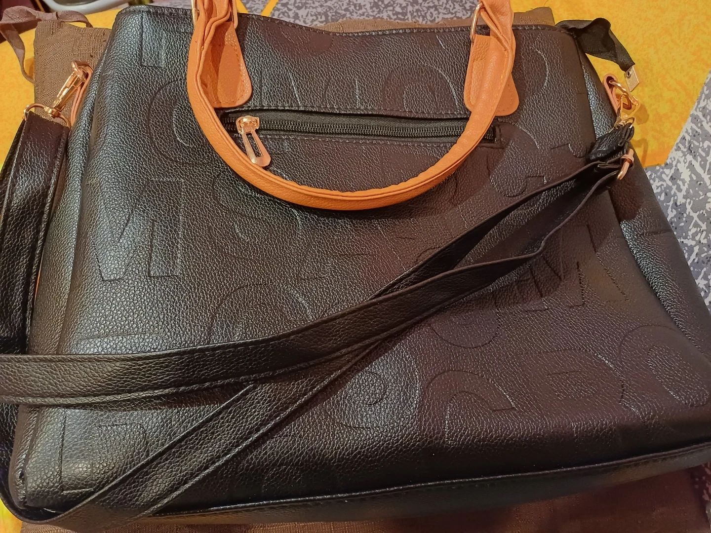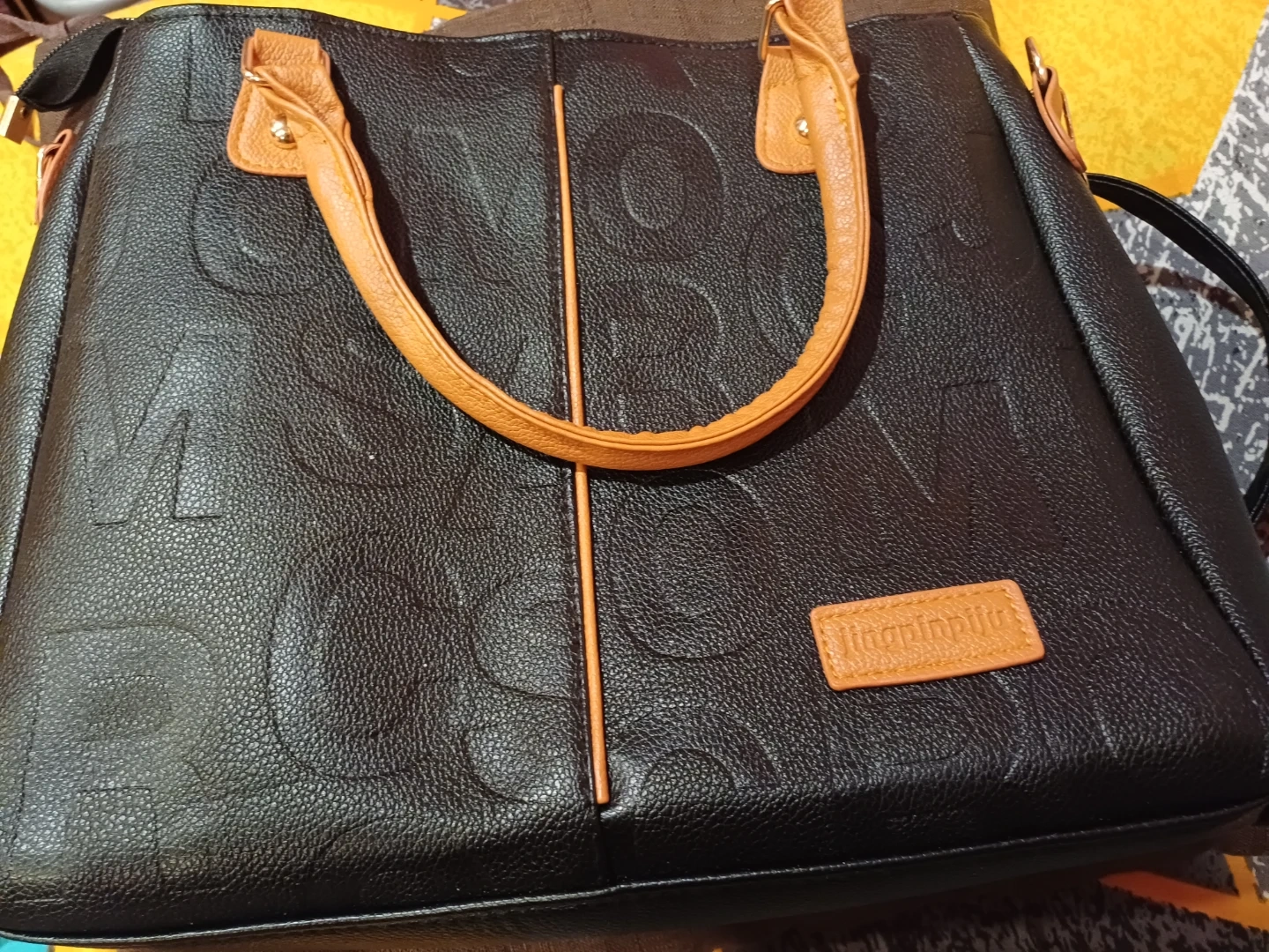 Stylish black tote bag with a shoulder strap! It features a unique embossed letter design and tan handles. Perfect for everyday use