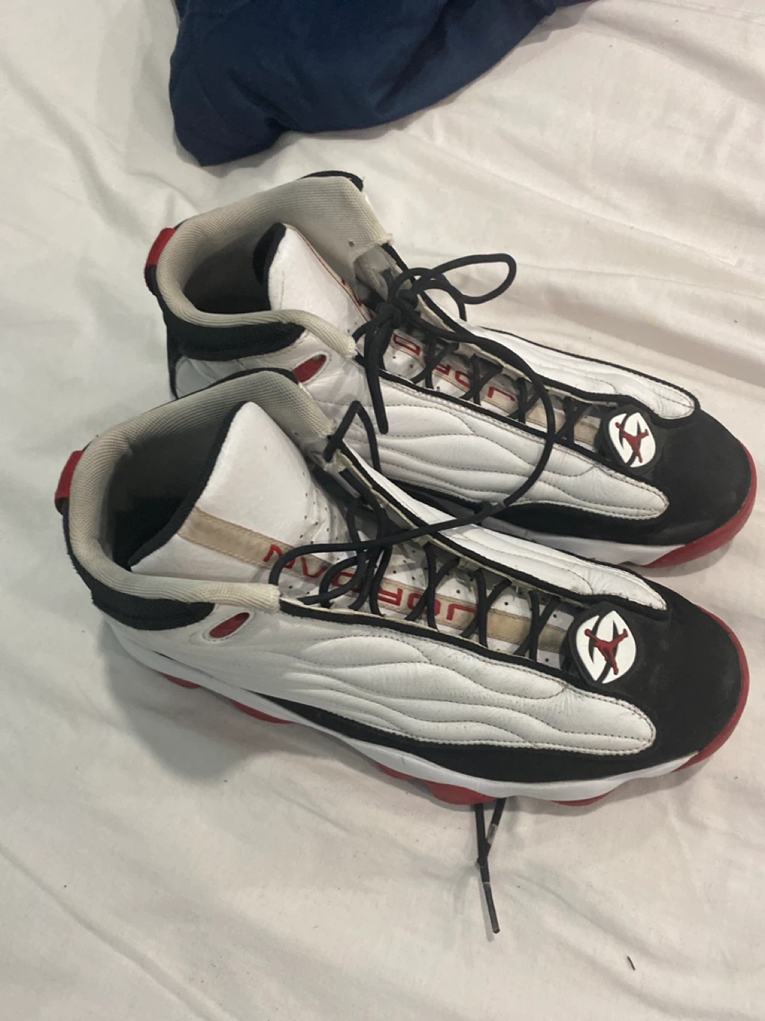 White, black, and red high-top Jordan basketball shoes. Features lace-up closure and Jumpman logo details. Good condition for their age!