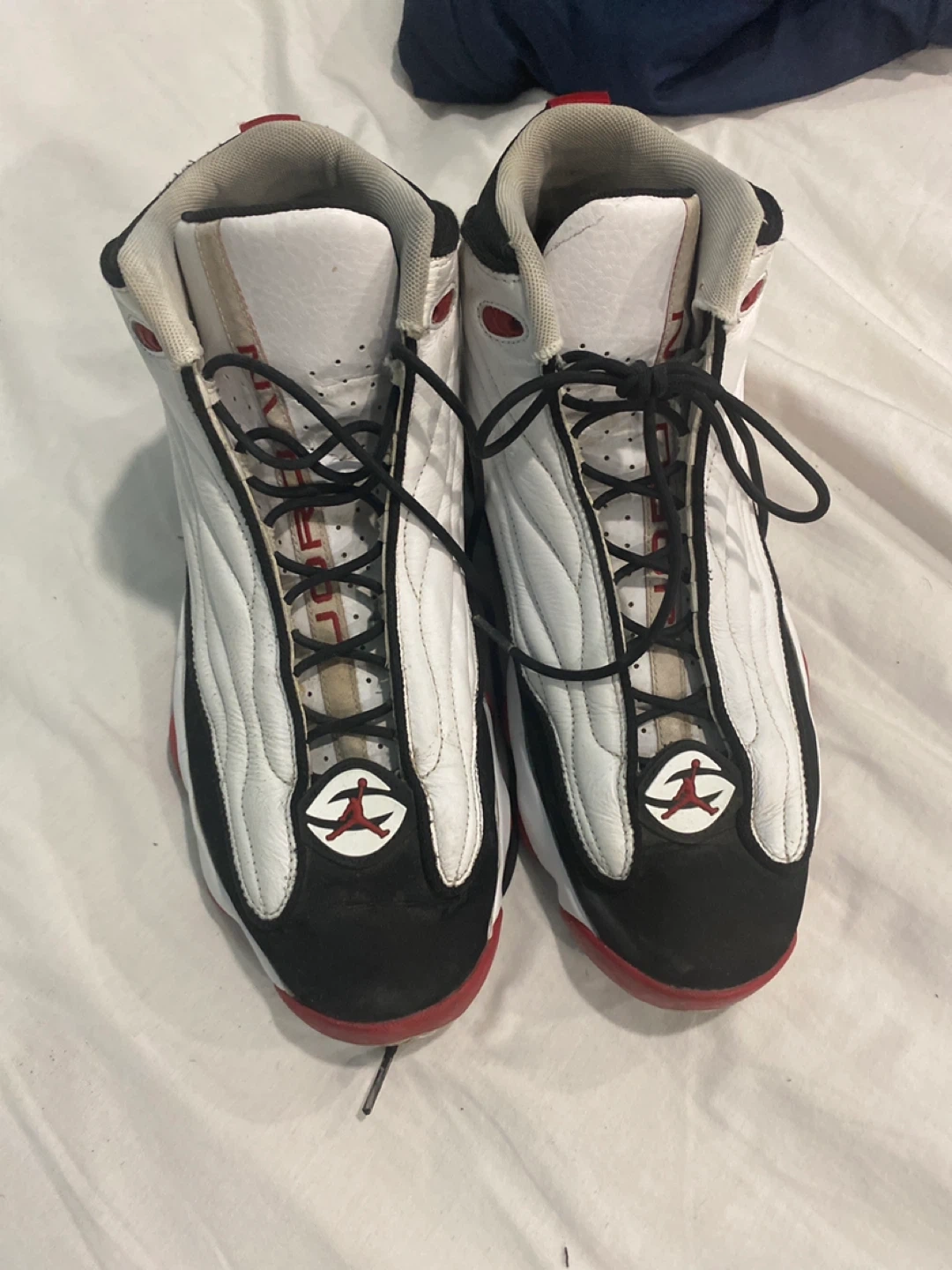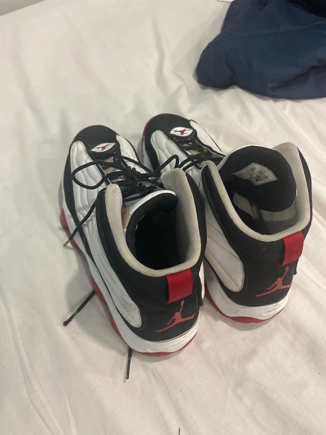 White, black, and red high-top Jordan basketball shoes. Features lace-up closure and Jumpman logo details. Good condition for their age!