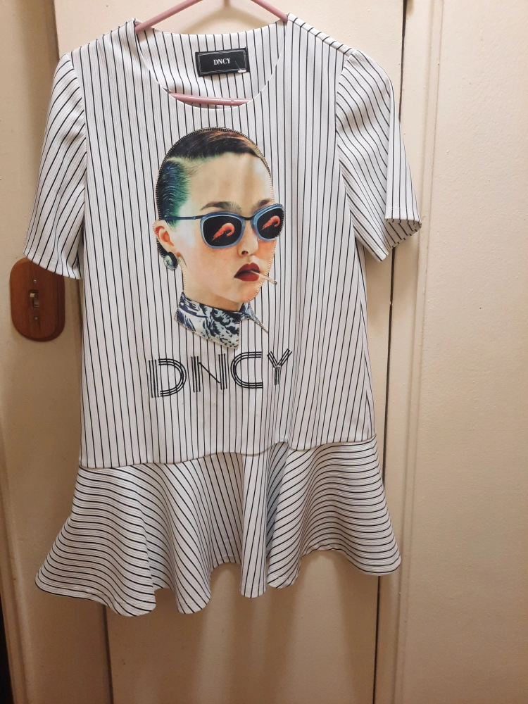This is a cute DNCY dress with a unique graphic print on the front. It features a striped pattern and a ruffled hem. Perfect for a casual outing!