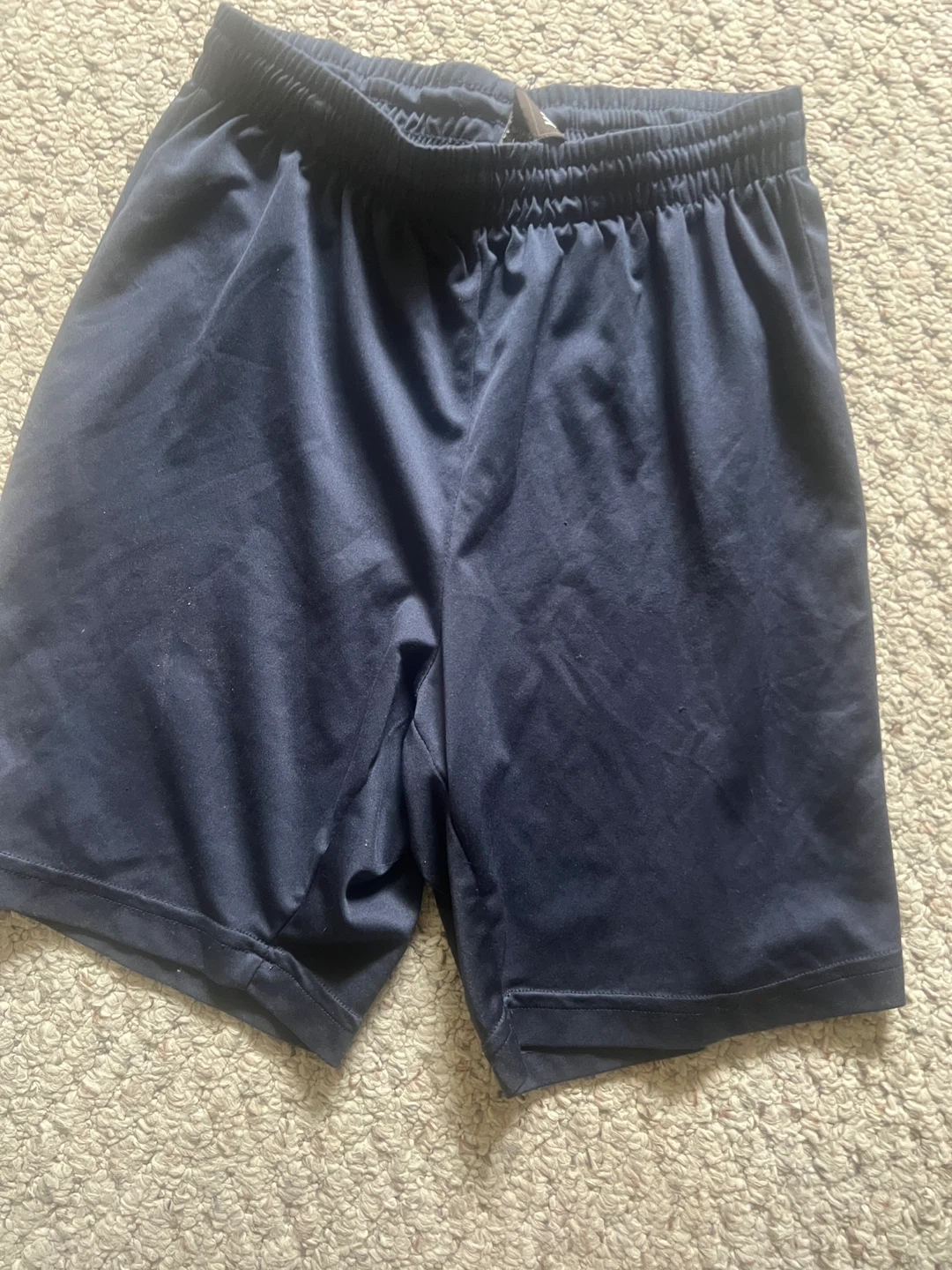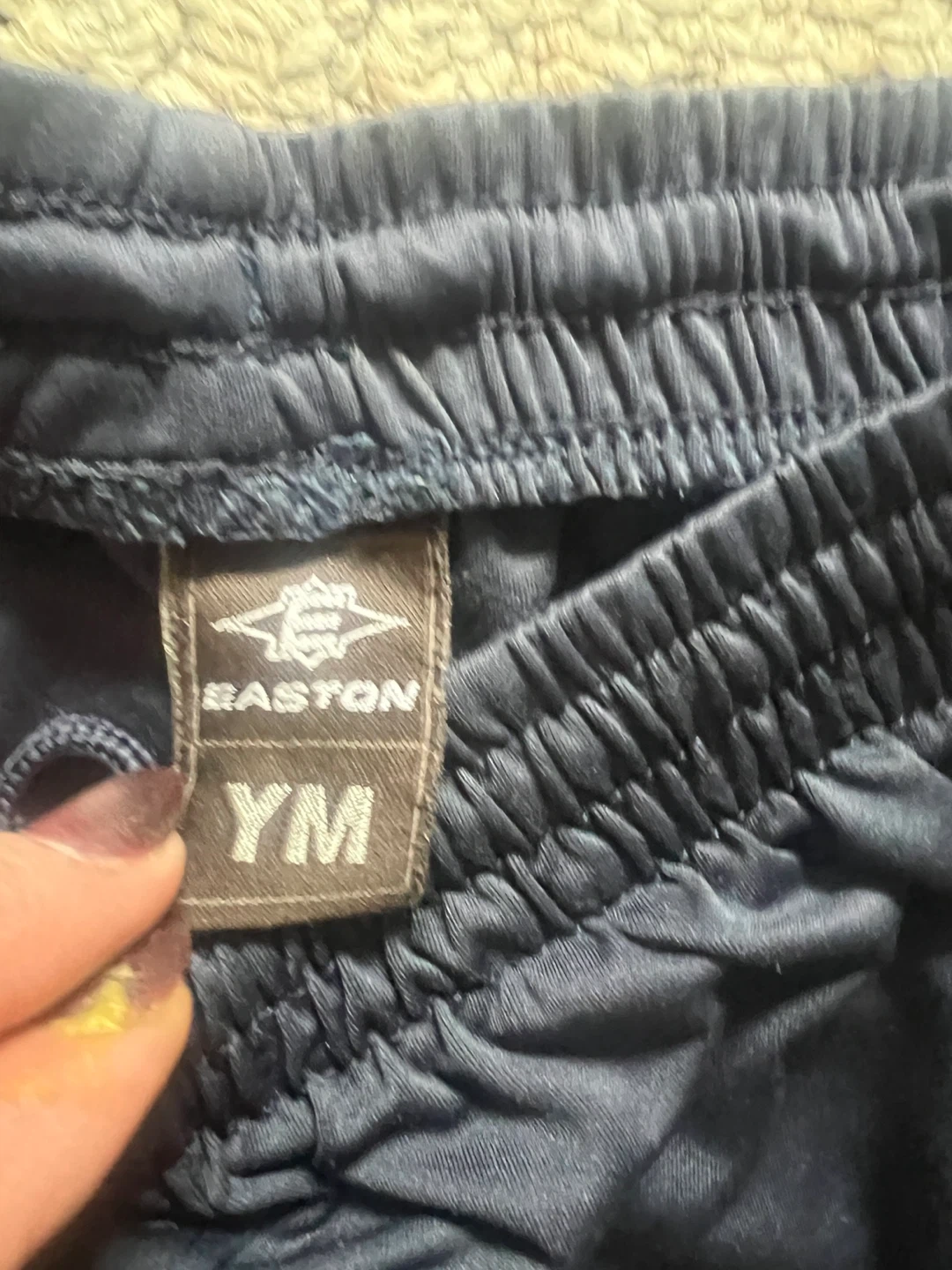 These navy blue athletic shorts are from Easton and are a youth medium size. They have an elastic waistband and are made of a smooth, lightweight material. They're suitable for sports or casual wear.