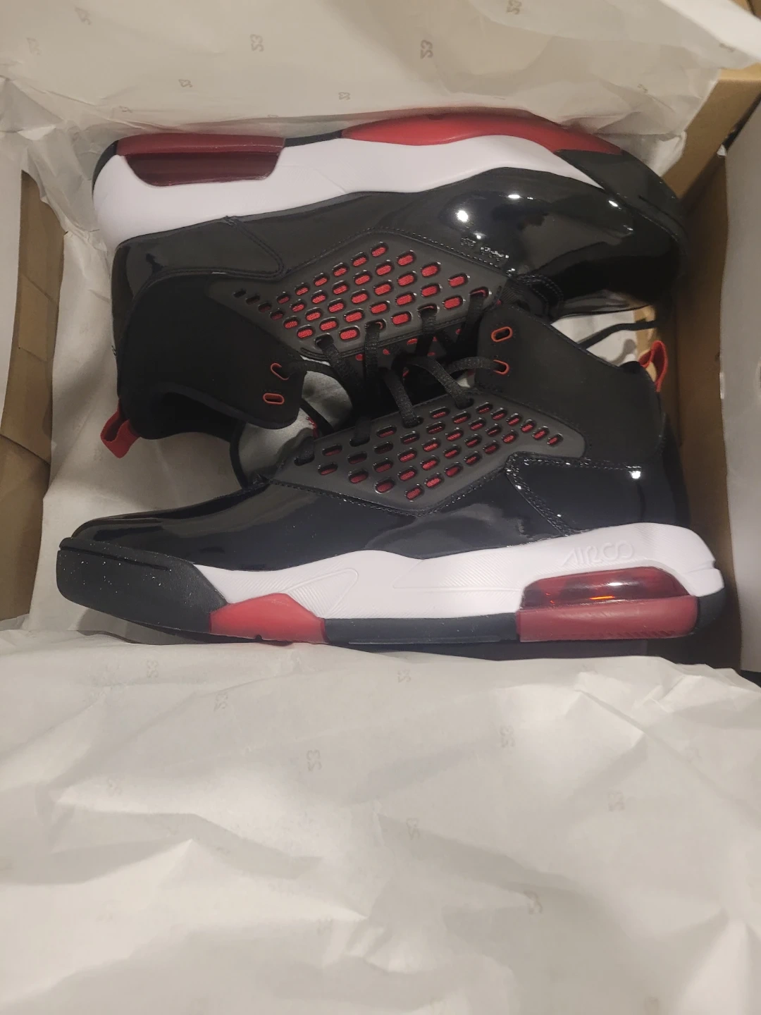 Nike Air Max 200 sneakers in black, red, and white. Comes in original box with tissue paper. These shoes feature patent leather accents and visible Air Max cushioning. Great for everyday wear!