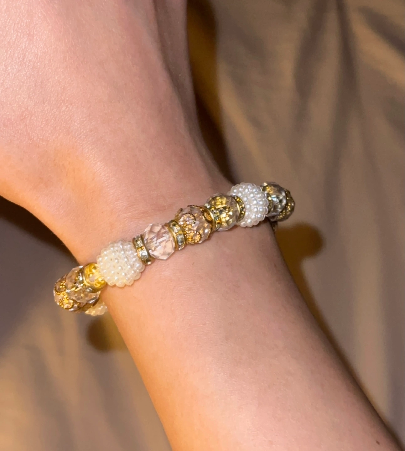 Selling a pretty beaded bracelet! It features a mix of gold-toned and pearl-like beads, with some crystal accents for a bit of sparkle. Perfect to dress up any outfit!