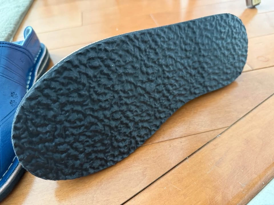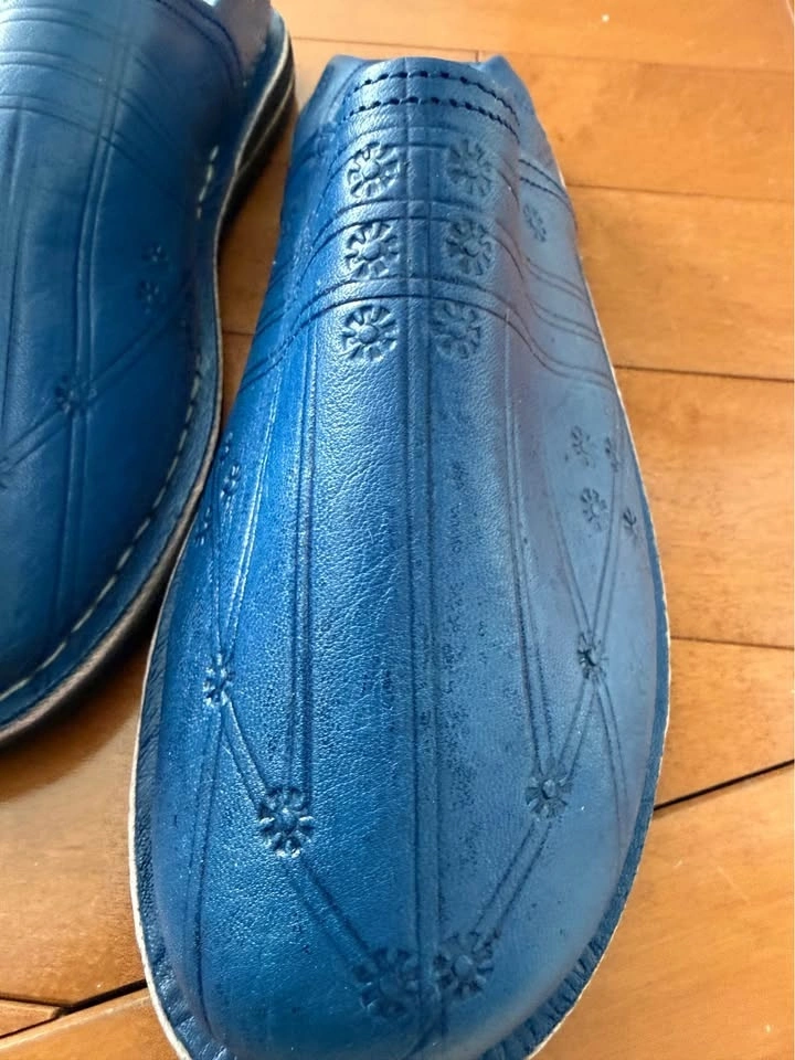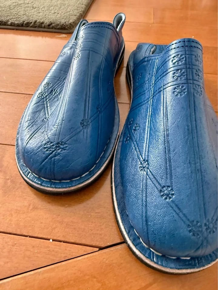 Stylish blue slip-on shoes. Real leather with embossed floral and geometric patterns. Has comfy textured black soles. Good for lounging or casual wear. Size is 9.