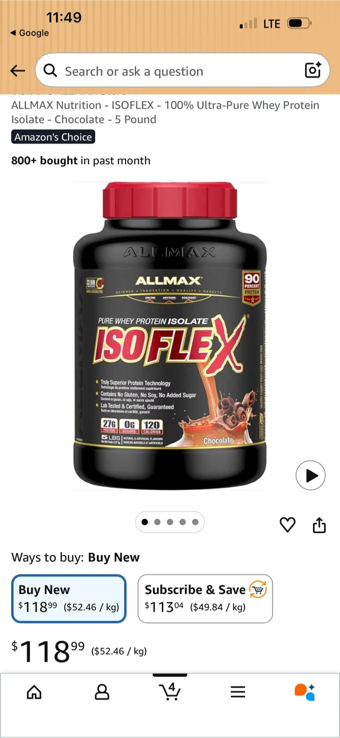 ALLMAX Isoflex 100% Ultra-Pure Whey Protein Isolate in Chocolate flavour. 5-pound container. Contains no gluten, no soy, and no added sugar. Lab tested and certified.