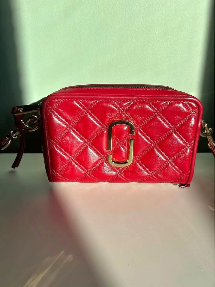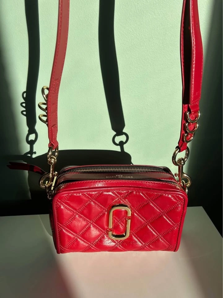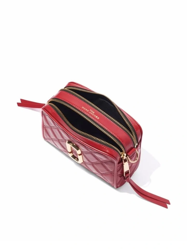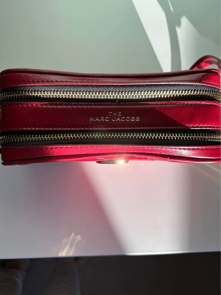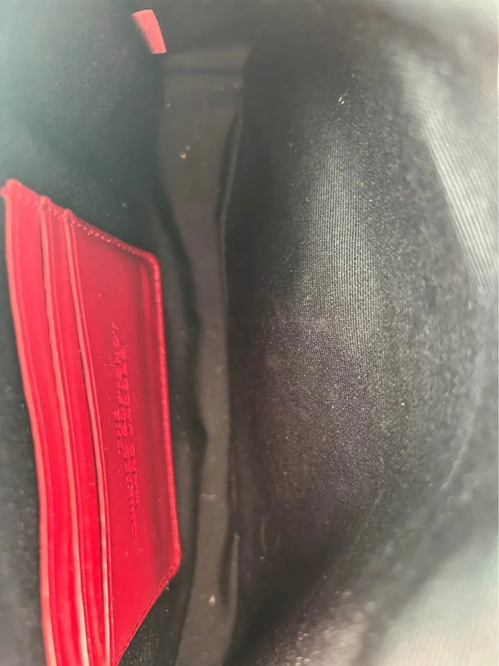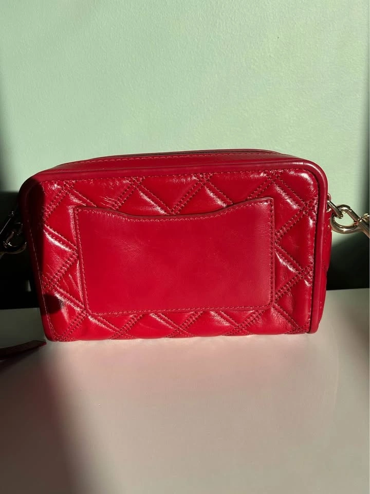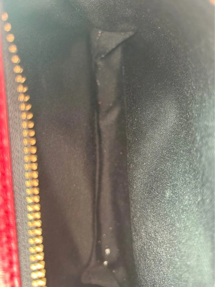 Dark red lambskin with an adjustable, detachable shoulder strap. Features two zip-fastening compartments and a slip pocket to the rear. Gold tone hardware. Dimensions: 21cm x 15cm x 9cm. Used only a couple of times, it's like new. Includes the original dust bag.