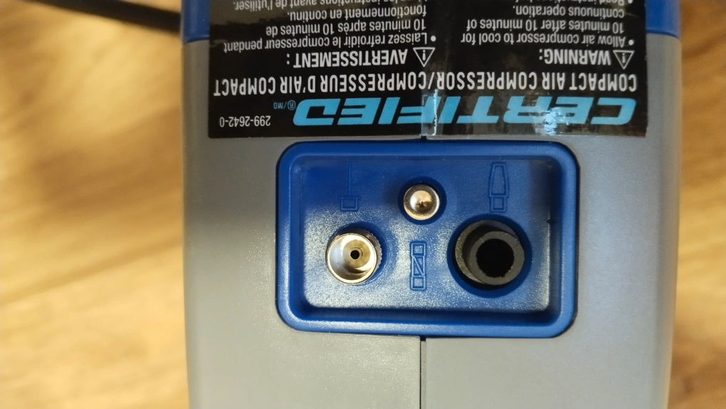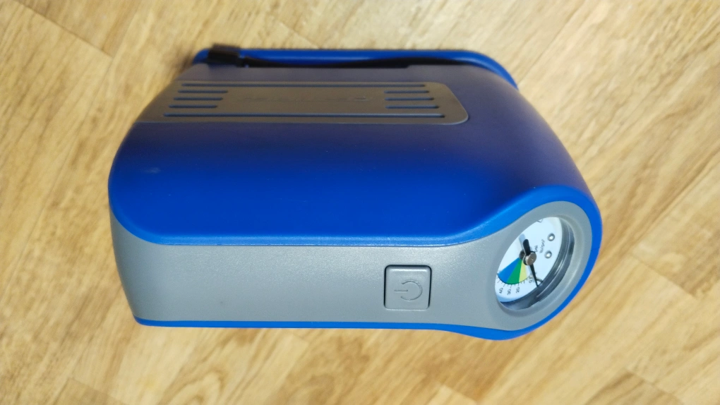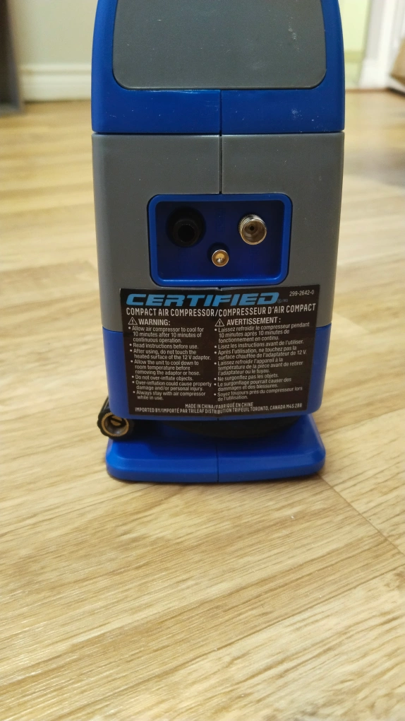 Portable air compressor. Blue and grey. Includes air hose. Gauge measures PSI and kPa. Used, but in good condition. Power cord missing, but if you have any of the suggested cords, the machine works perfect!