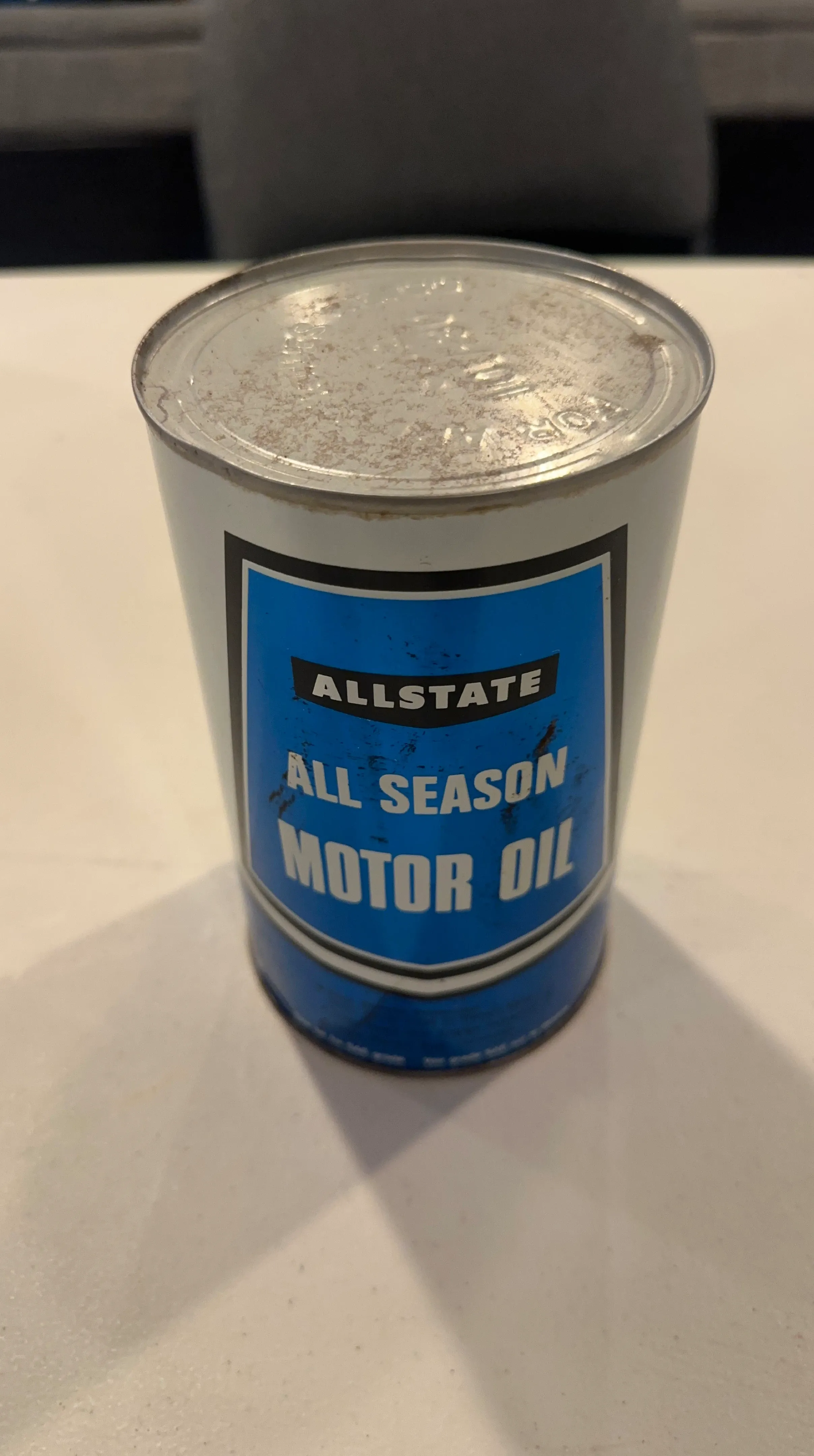This is a vintage can of Allstate All Season Motor Oil. It's a great collectible for any automotive enthusiast! The can has some signs of wear and tear, consistent with its age.