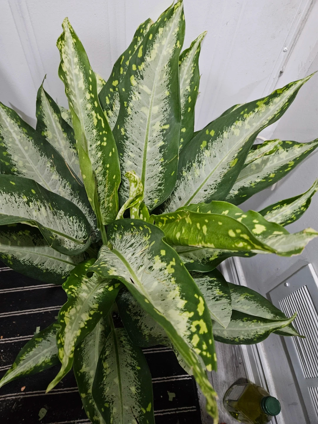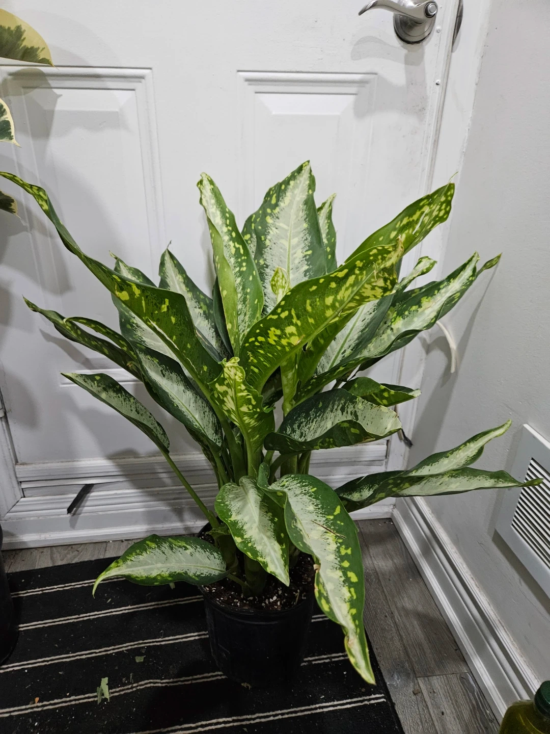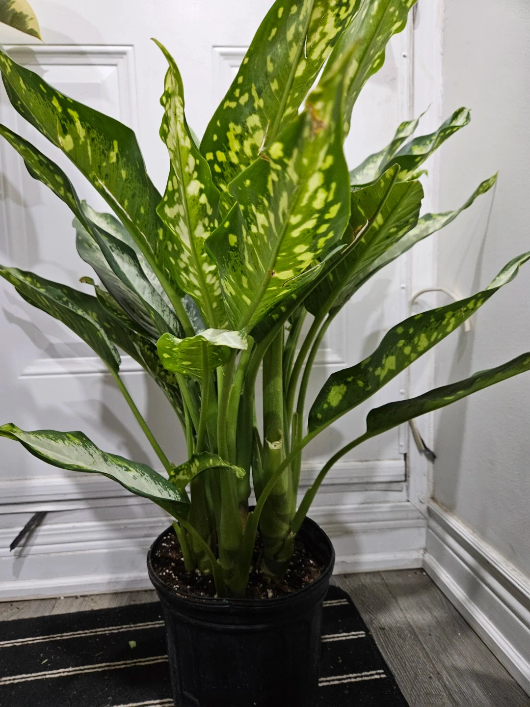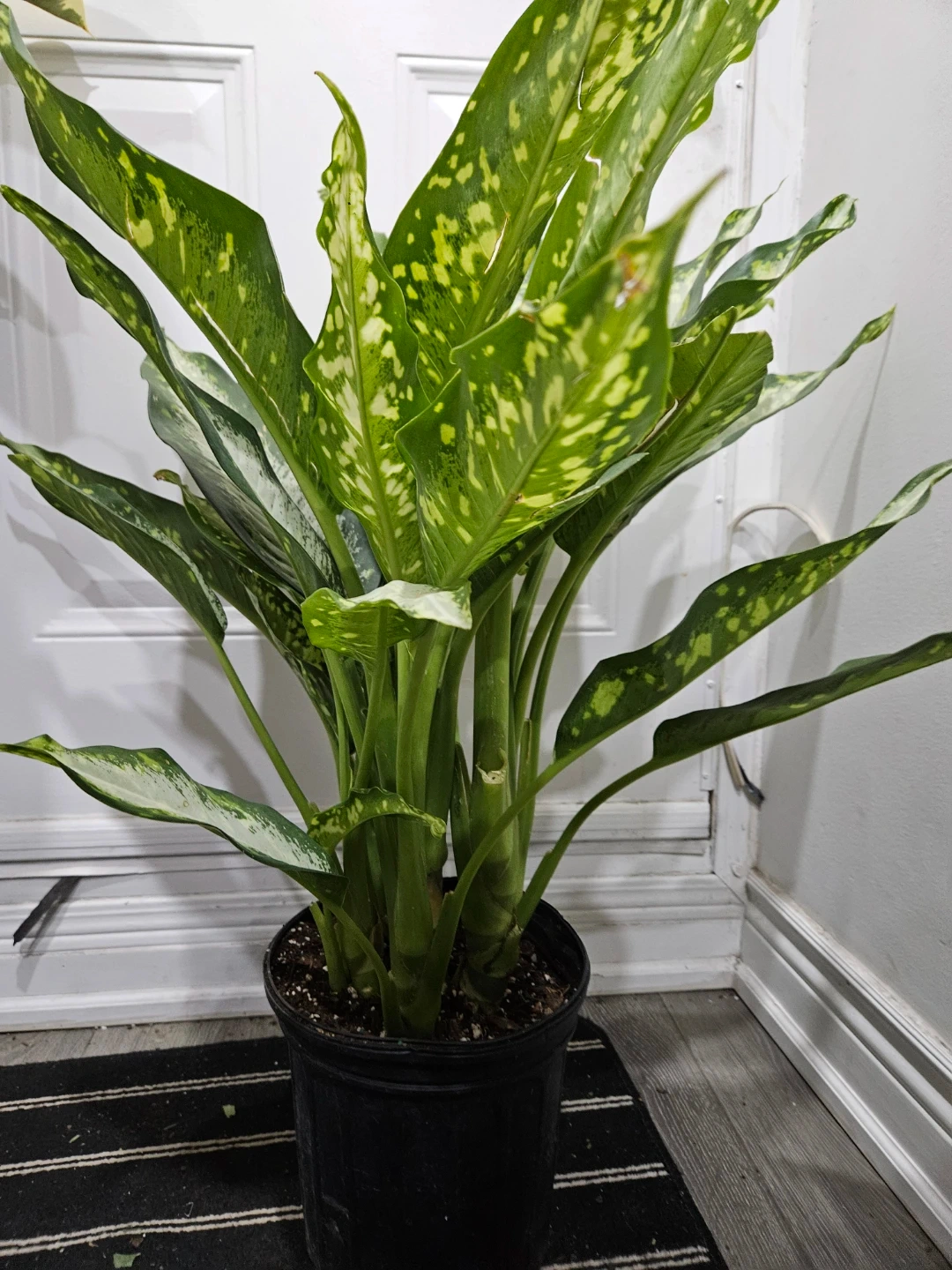 This Dieffenbachia Tropic Marianne plant features striking green and white variegated leaves. It's potted in a standard black plastic planter. This houseplant brightens up any indoor space with its lush foliage.