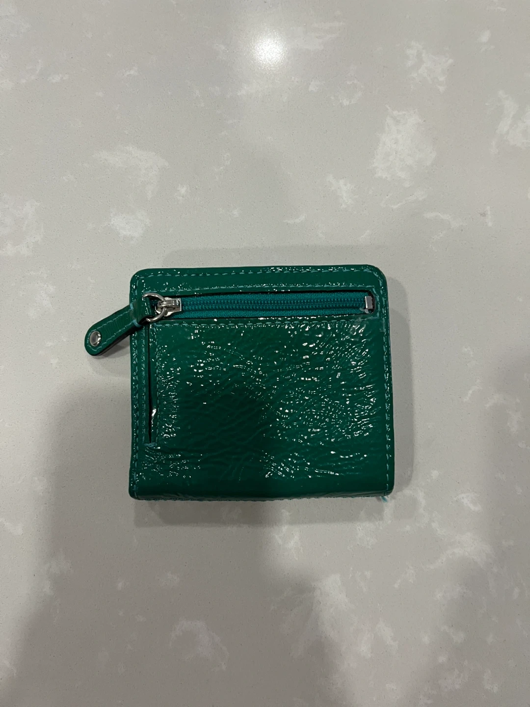 This is a pre-loved Coach trifold wallet in a vibrant green patent leather finish. It features multiple card slots, a clear ID window, and a zippered coin pocket. Compact and stylish, it's suitable for everyday use.