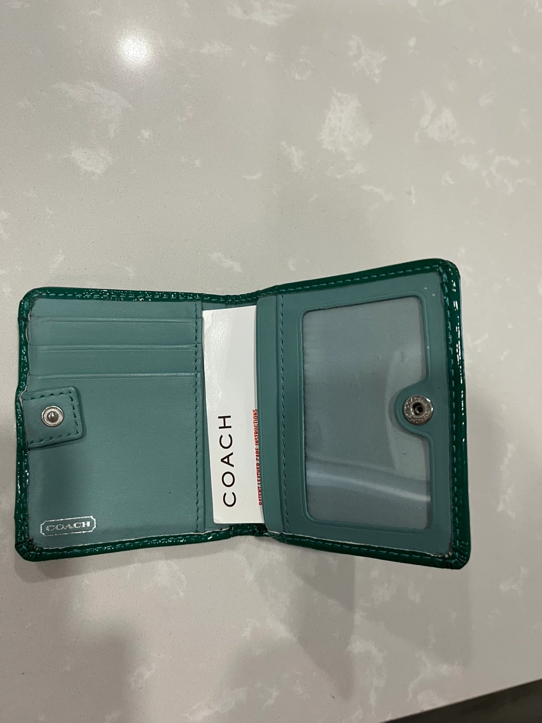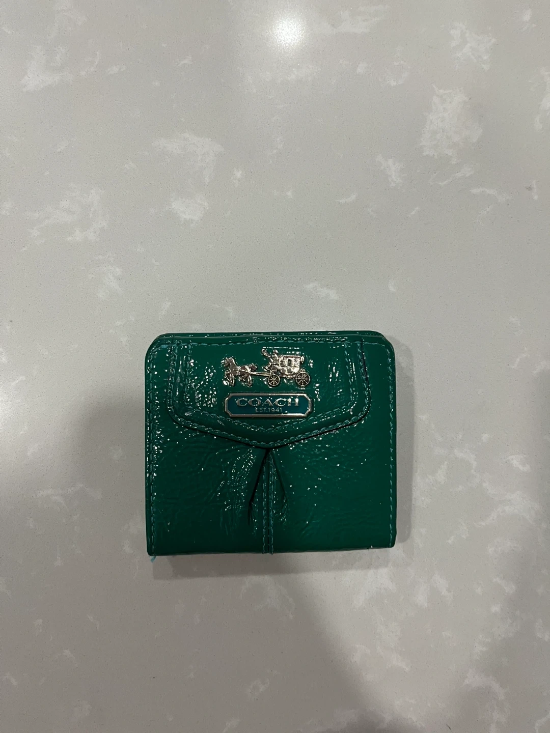 This is a pre-loved Coach trifold wallet in a vibrant green patent leather finish. It features multiple card slots, a clear ID window, and a zippered coin pocket. Compact and stylish, it's suitable for everyday use.