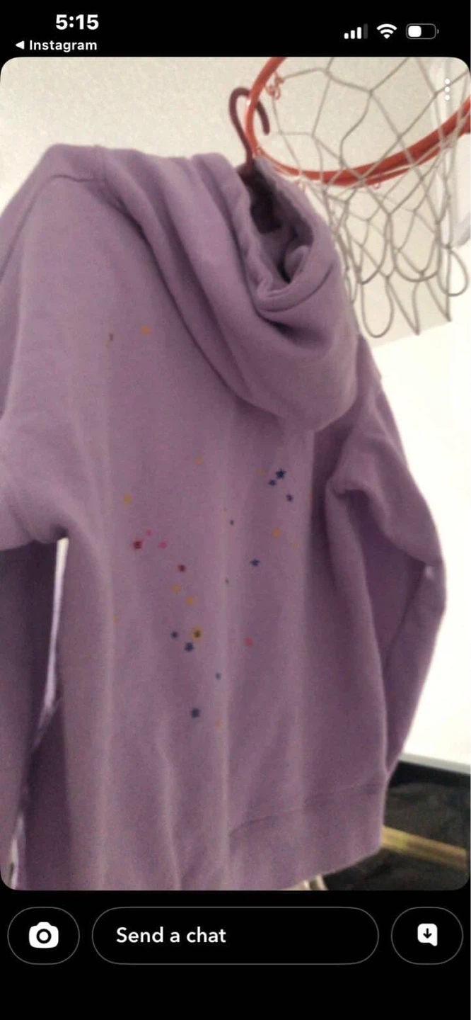 This is a purple Sp5der hoodie with a spiderweb graphic and speckles. It's made of a soft material and has a front pocket. This hoodie is perfect for casual wear. Interested in trades. OBO.