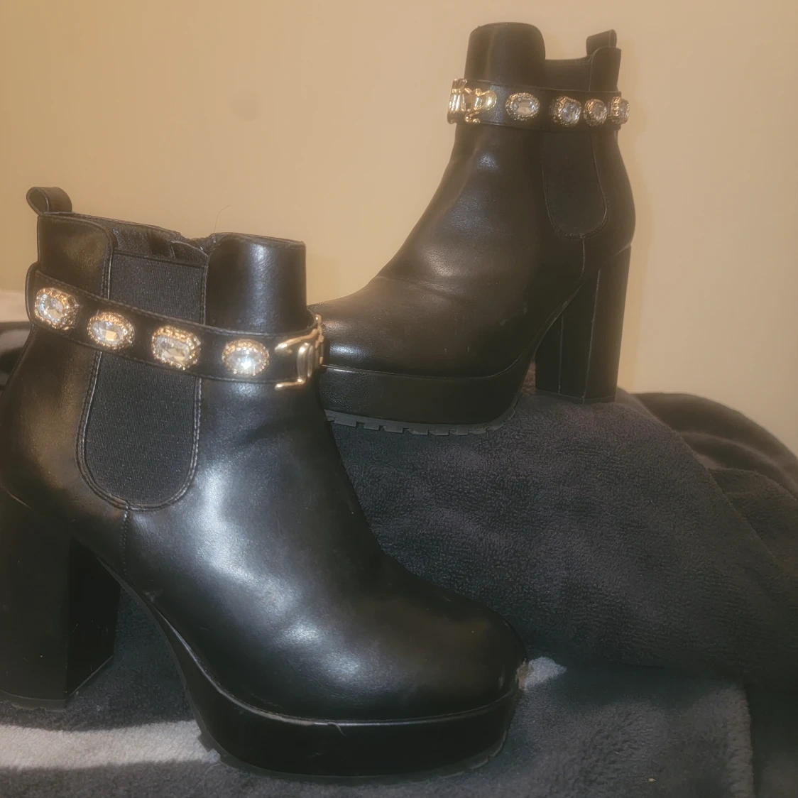 Cute black platform ankle boots! They have a fun rhinestone detail around the ankle. Perfect for adding a bit of sparkle to your outfit!. SIZE 6