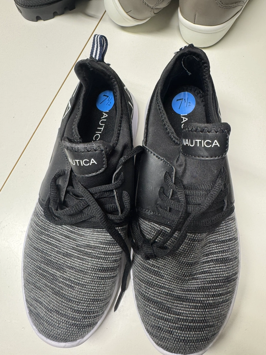 Black and grey slip-on sneakers. Knit upper. Lace-up closure. White sole. Size 7 1/2.