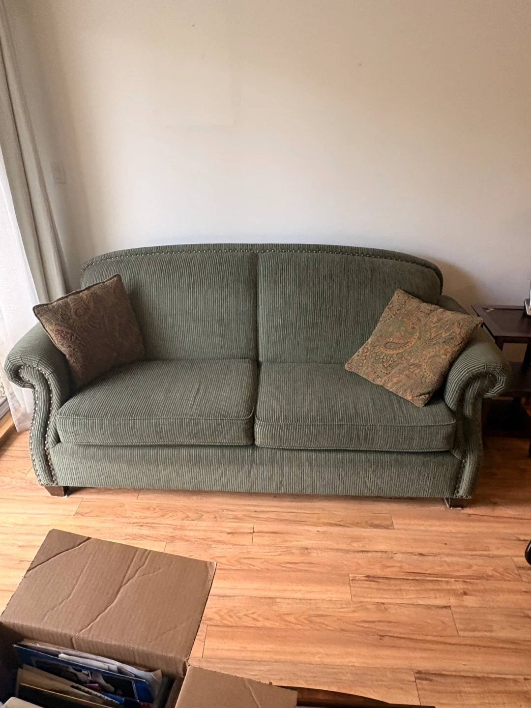 Comfortable green corduroy sofa. It comes with two patterned decorative pillows. Sofa has studded trim detailing along the base and arms. It's a lovely addition to any living space! Must pickup no deliveries and bring manpower to move.