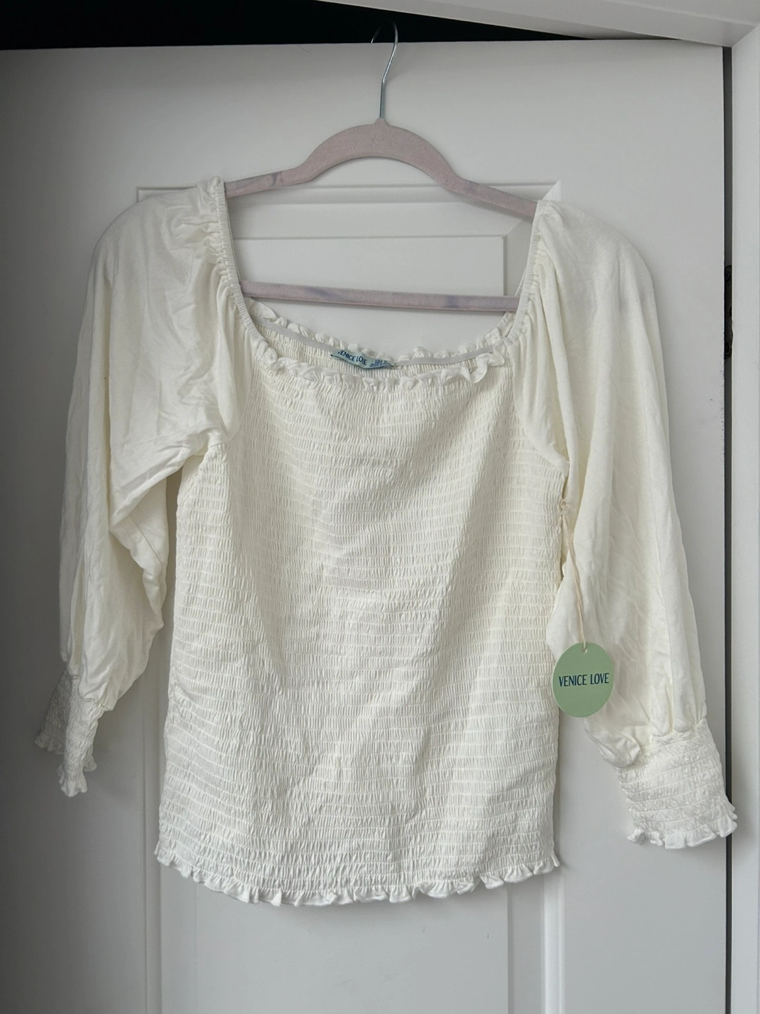 Two cute Venice Love smocked tops for sale! One is a soft pink colour and the other is cream colour. Material 95% Rayon, 5% Spandex. Both are brand new with tags and ready for a new home! Perfect for a casual day out or dressing up for an evening. $20.00 each regular $39.99 each plus tax.