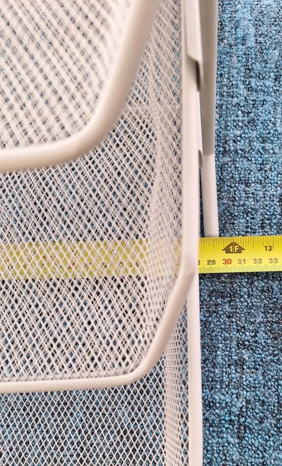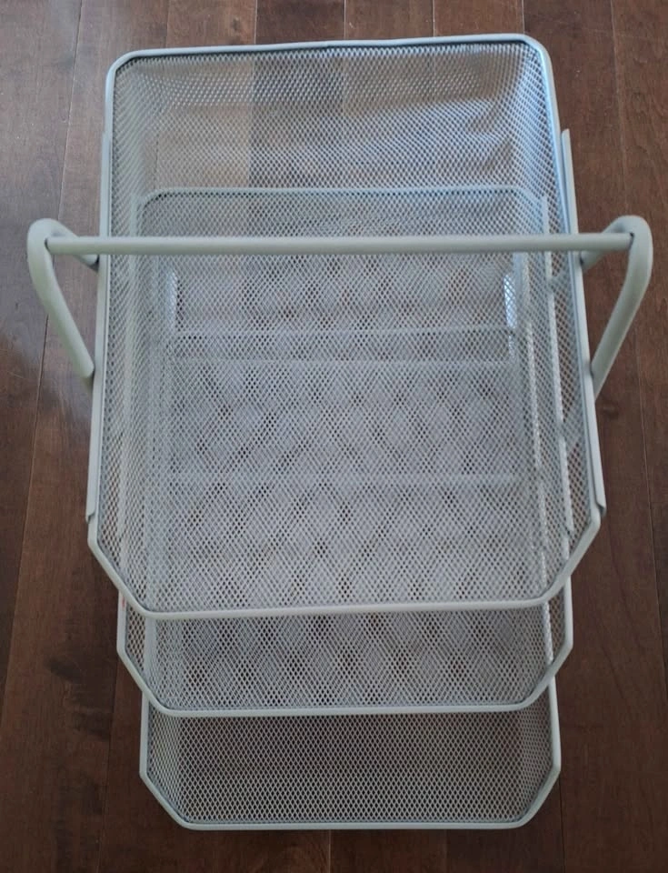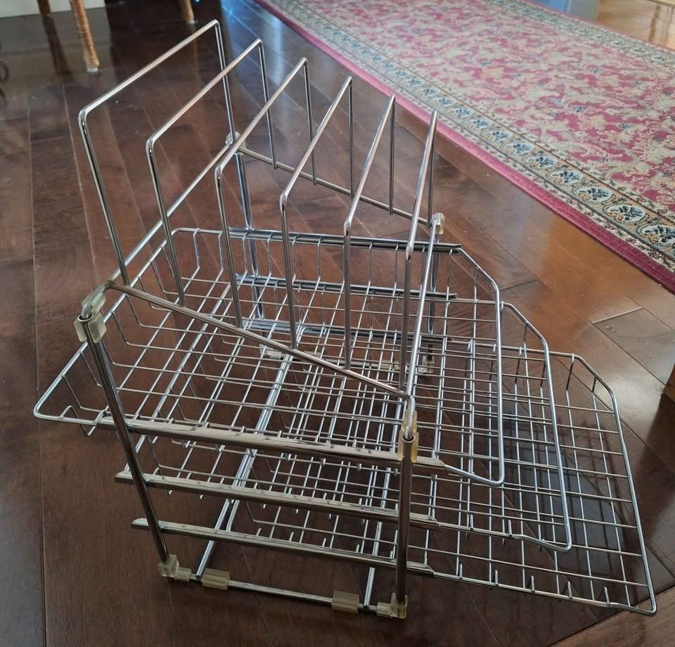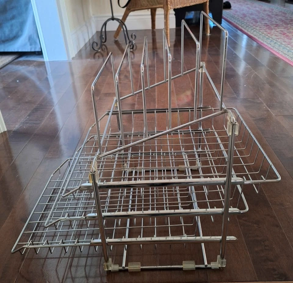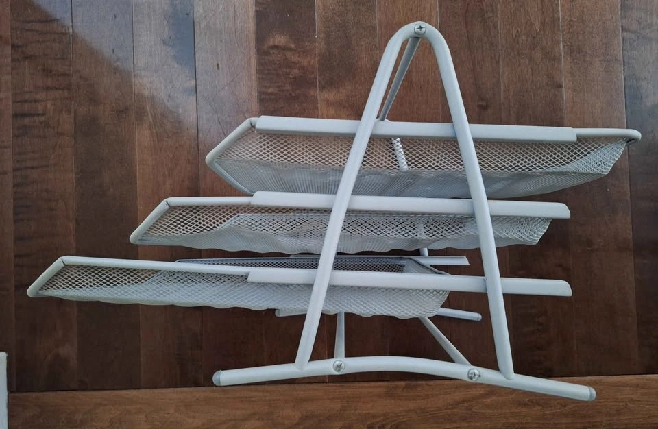 Chrome letter size organizer with 3 adjustable shelves and 5 slots. Measures 11.75" wide x min. 13" deep x 15.75" high. Asking $15.