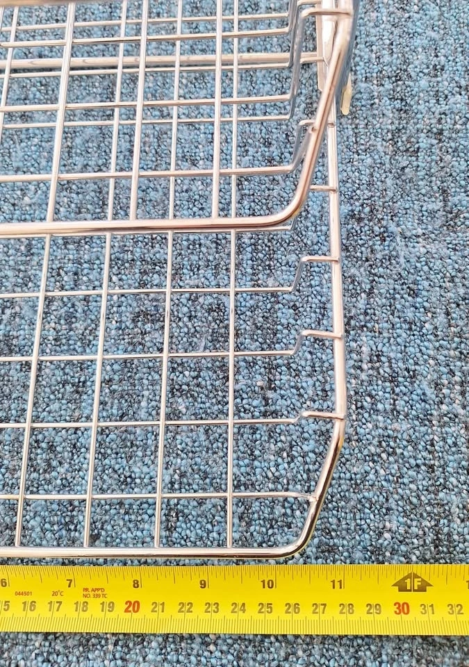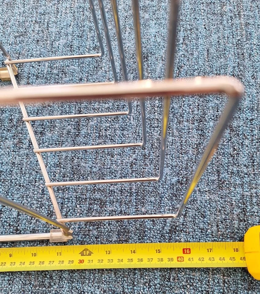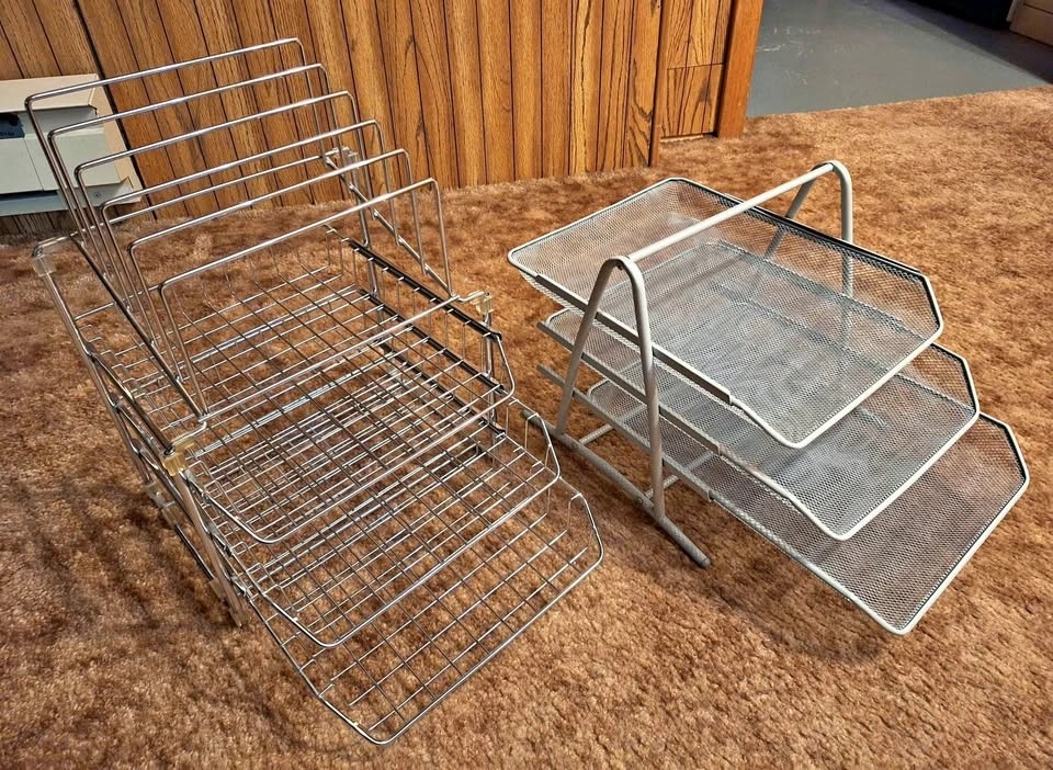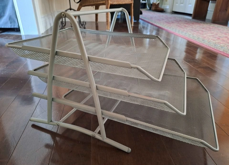 Chrome letter size organizer with 3 adjustable shelves and 5 slots. Measures 11.75" wide x min. 13" deep x 15.75" high. Asking $15.