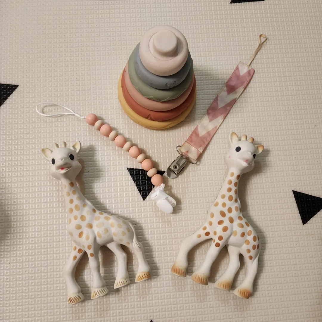Two Vulli Sophie la Girafe teethers for babies. It's made of natural rubber. A colourful teething stacking ring toy is also included. This set is great for sensory development.