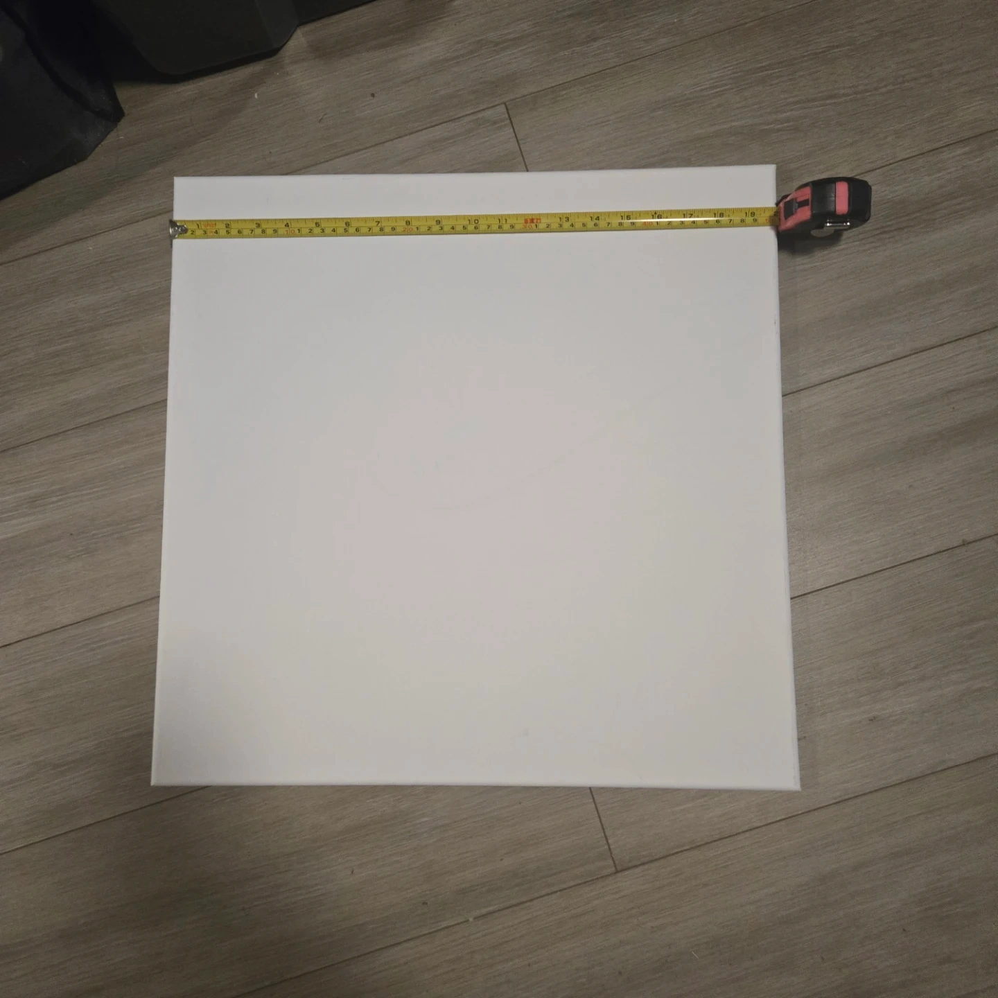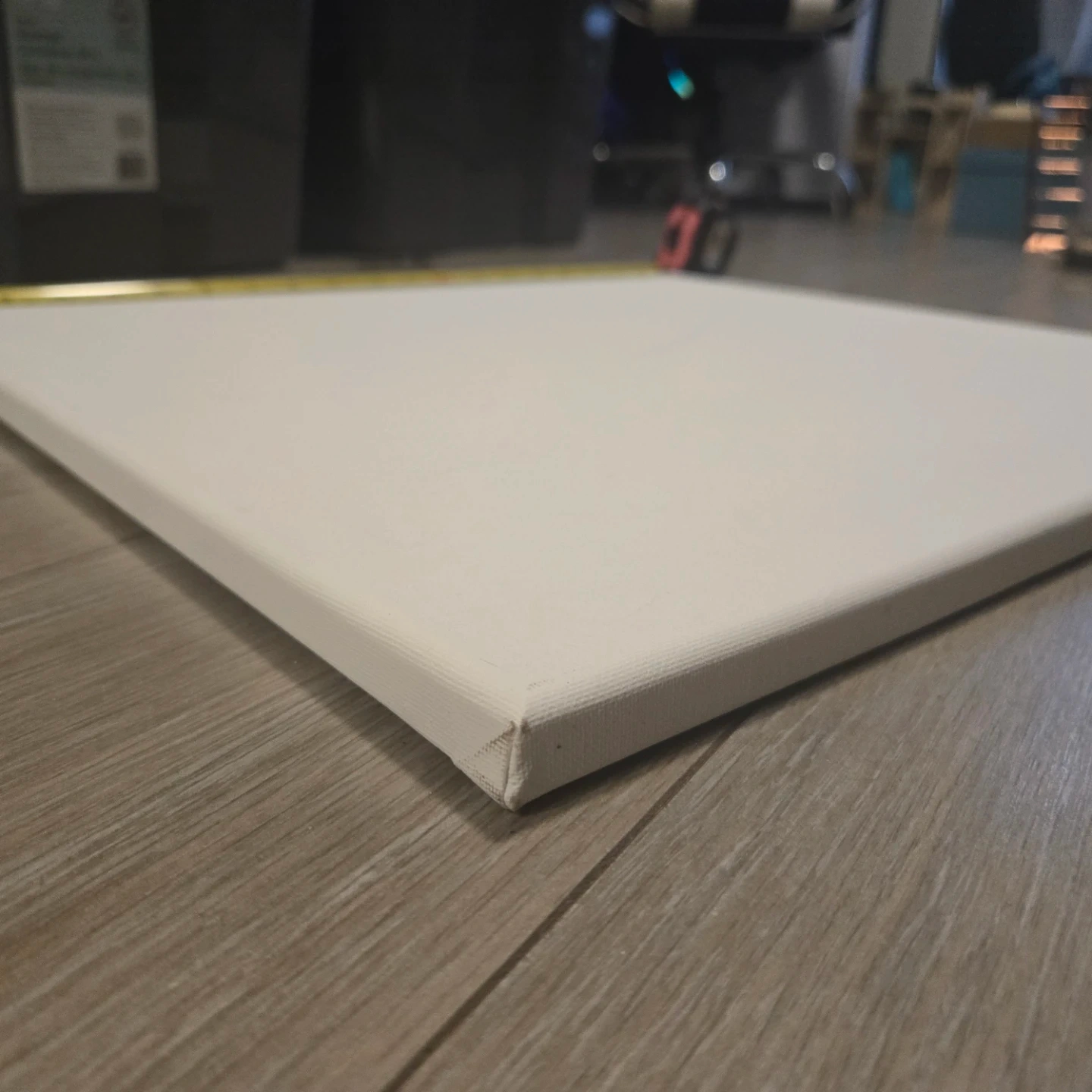 Blank stretched canvas, ready for your art projects. It's approximately 20 inches by 20 inches. The canvas is pre-primed and stretched on a wooden frame.