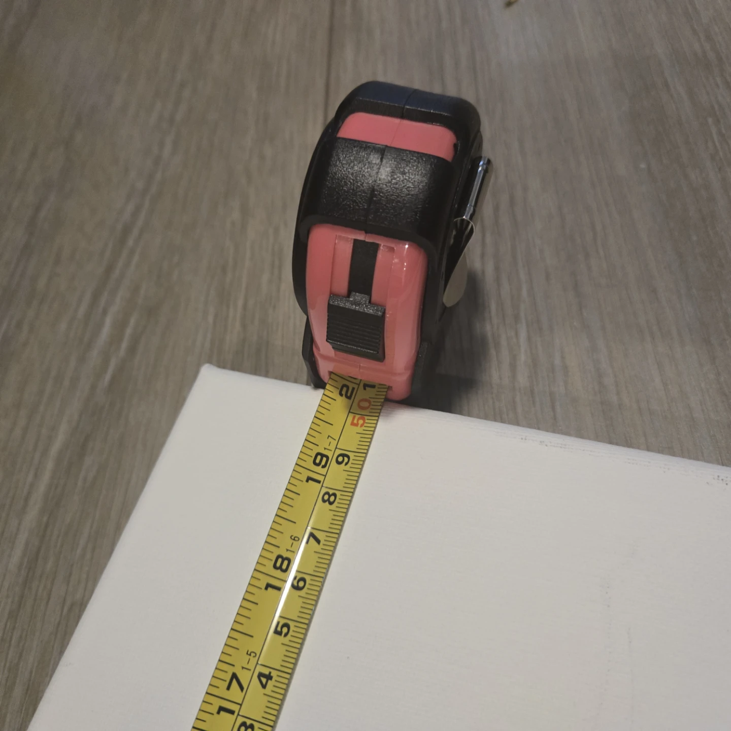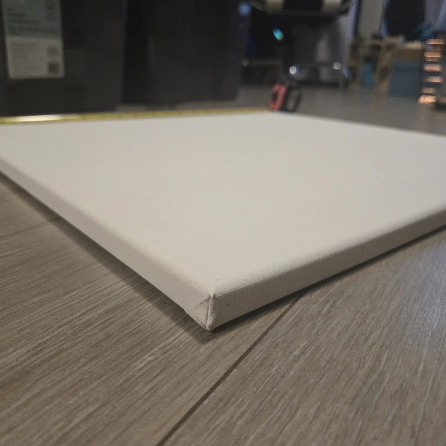 Blank stretched canvas, ready for your art projects. It's approximately 20 inches by 20 inches. The canvas is pre-primed and stretched on a wooden frame.