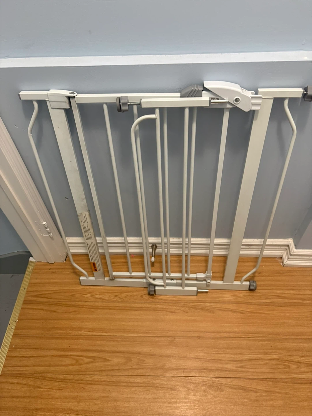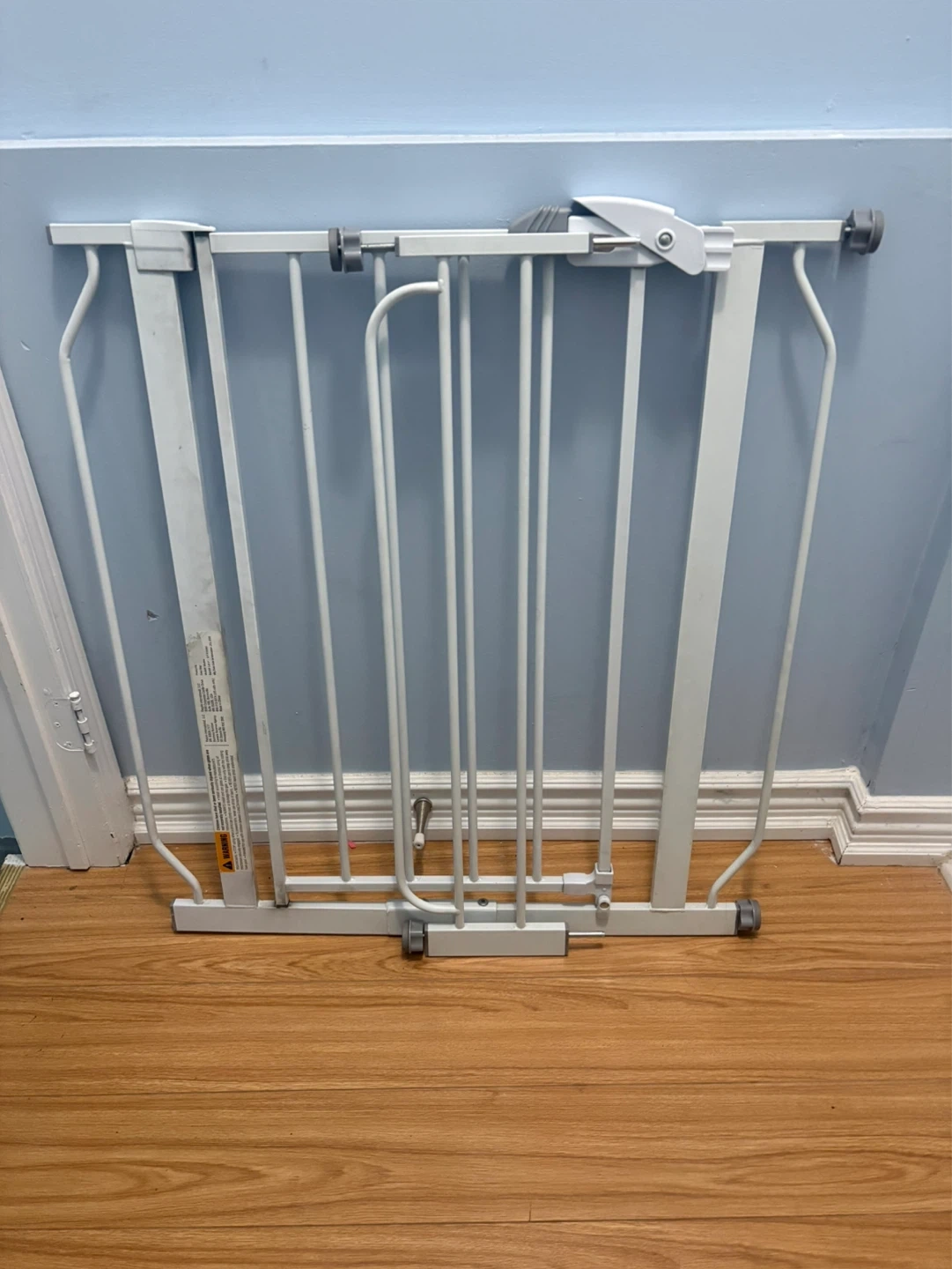 This is a white metal pressure-mounted baby gate. Easy to install and adjust.