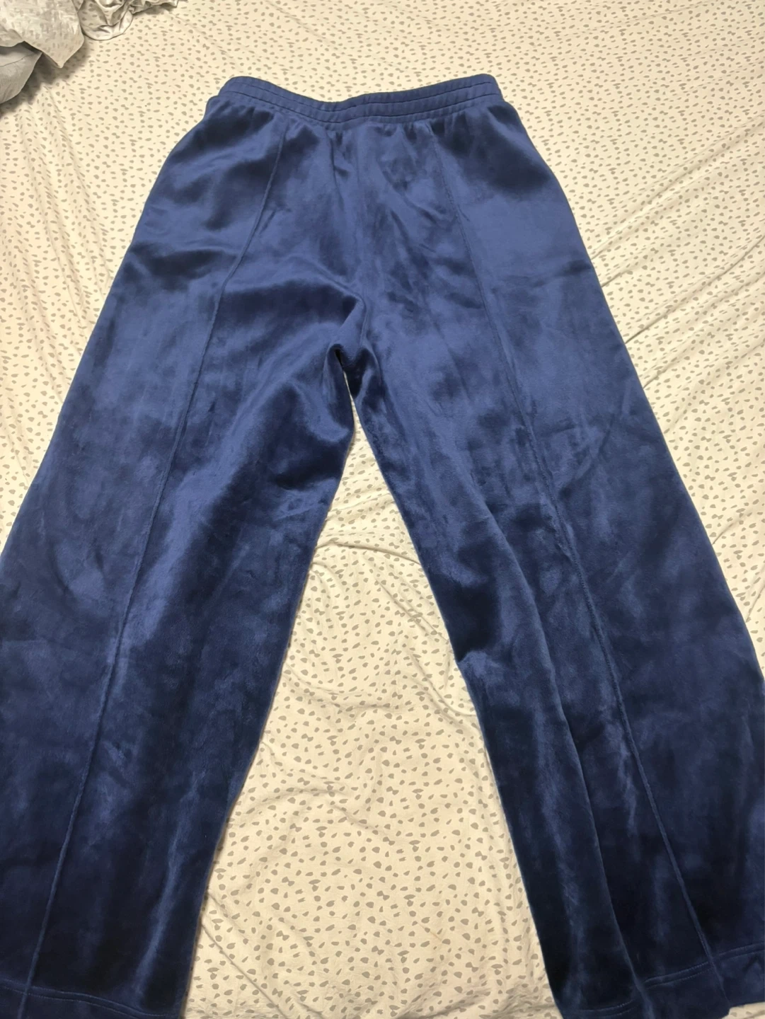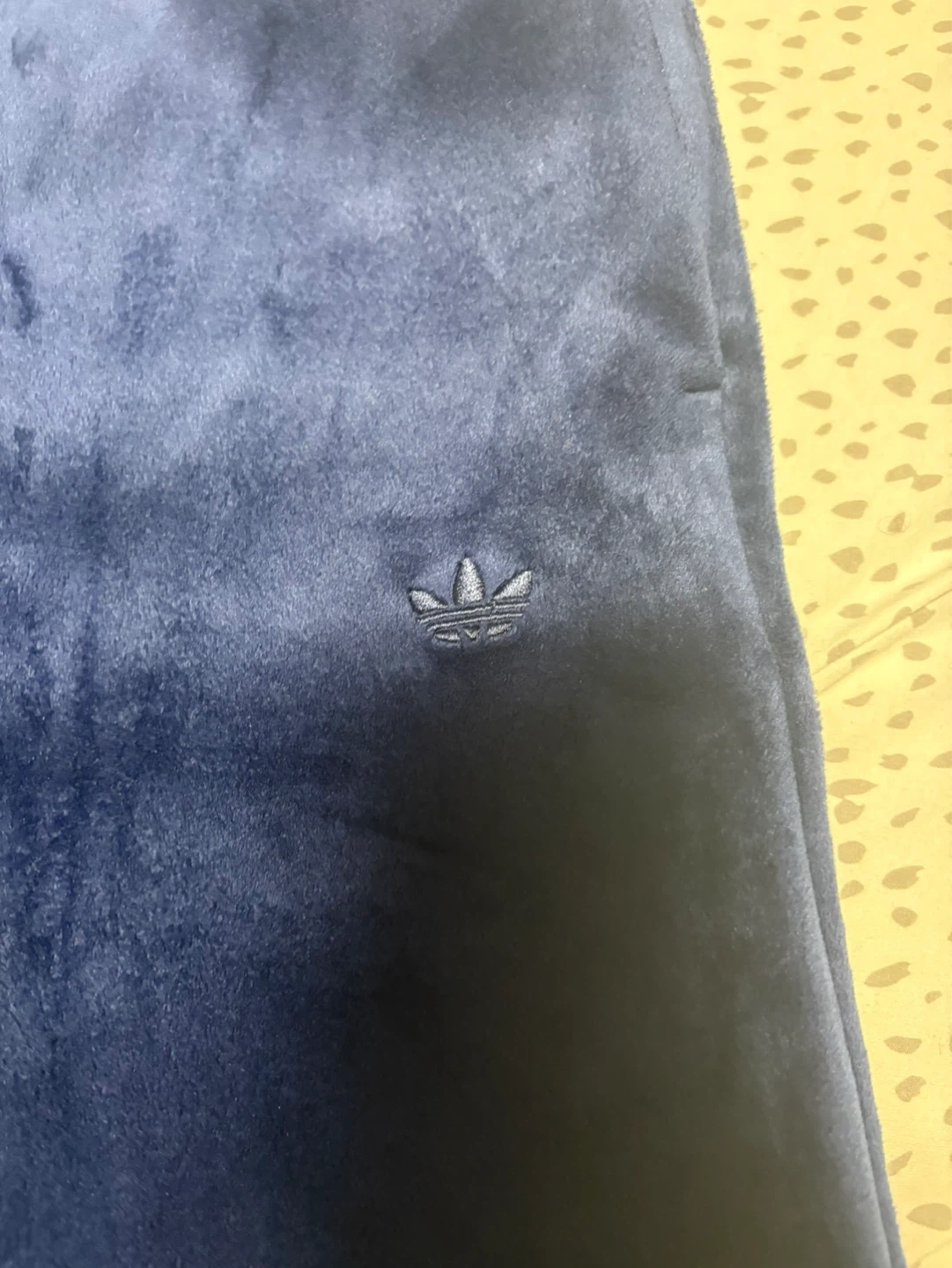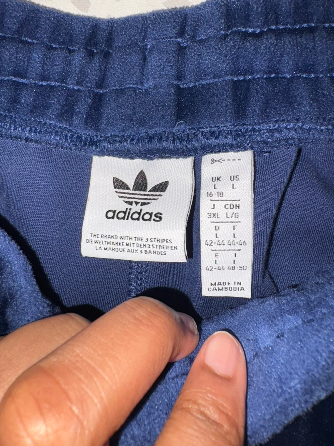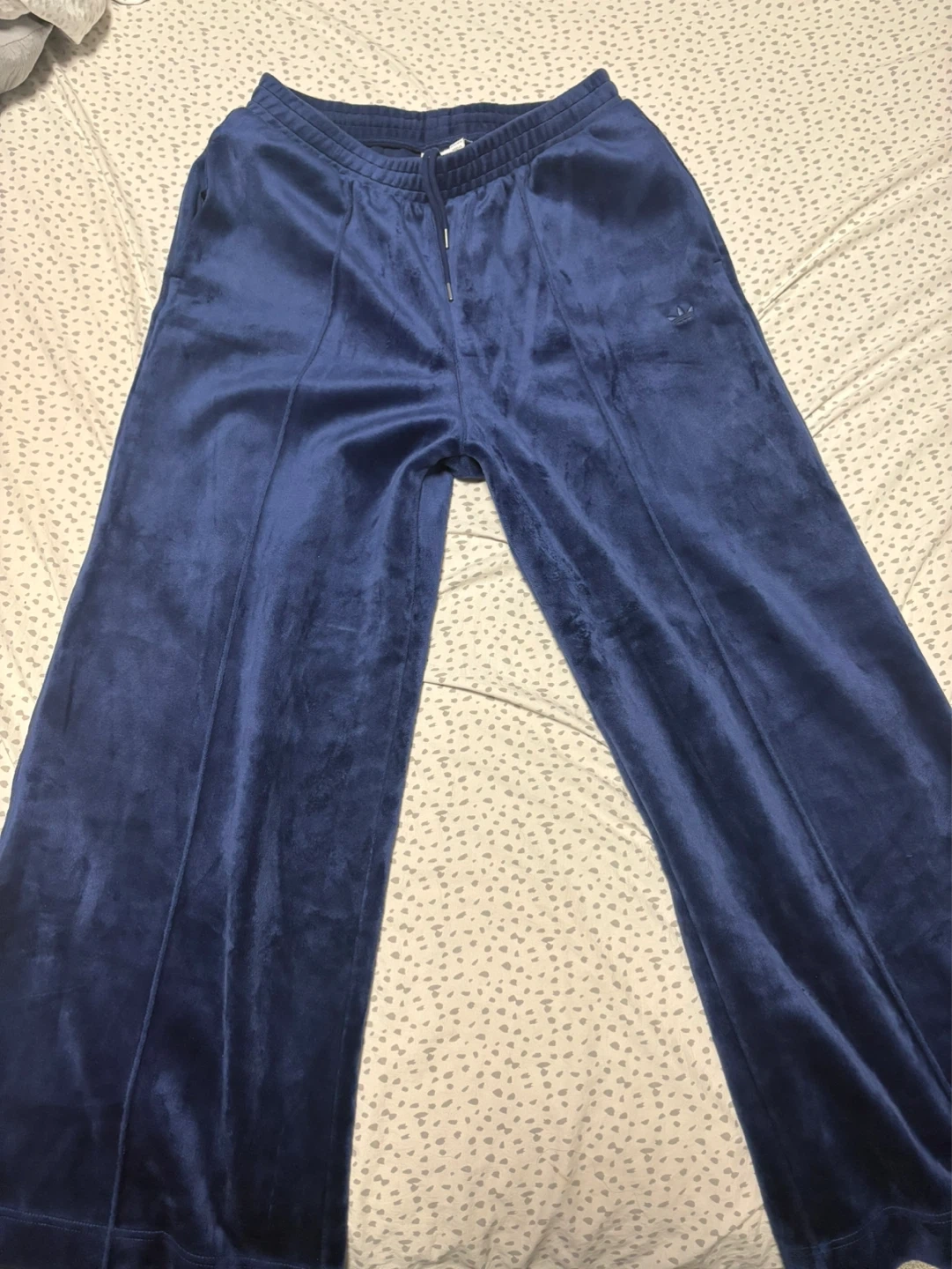 Comfortable navy blue Adidas velour track pants. Soft material with a classic Adidas logo detail. Size L/G fits a 3XL. Can fit smaller but would be oversized/baggy