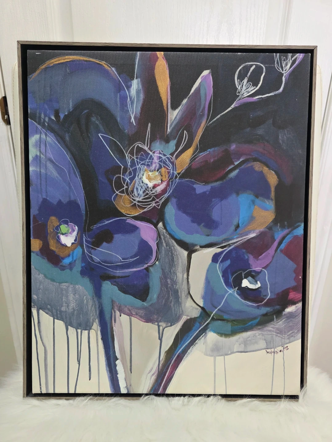 This framed canvas art features an abstract floral design with bold blues and purples. It measures approximately 20 inches by 16 inches. Adds a splash of colour to any room!