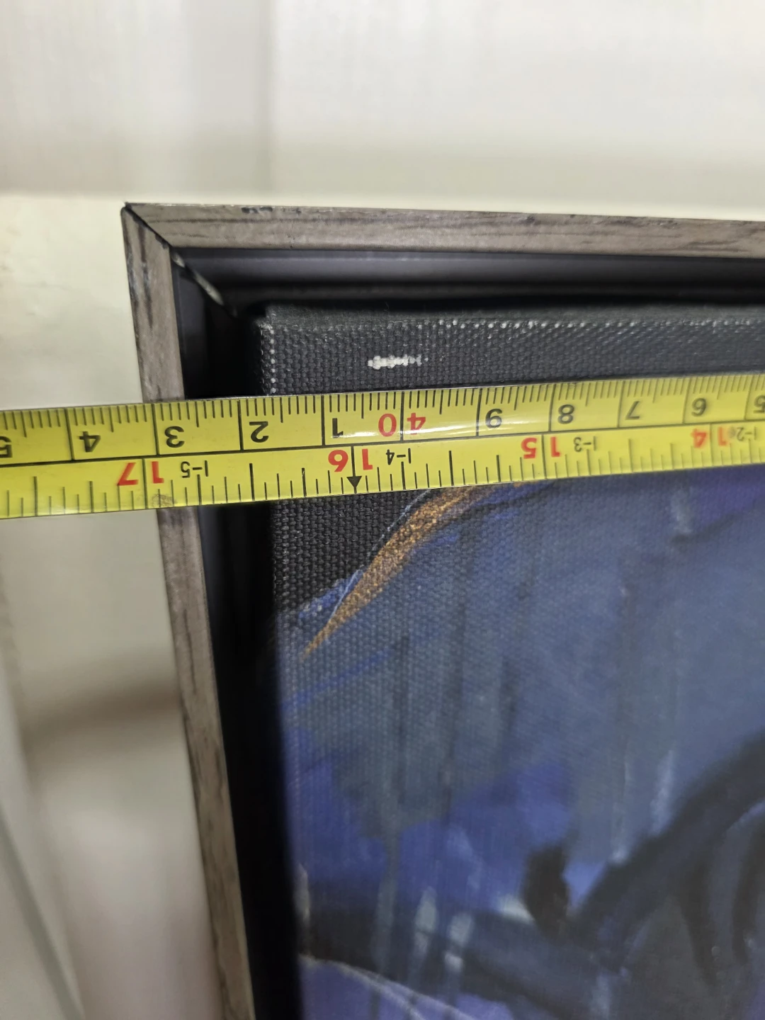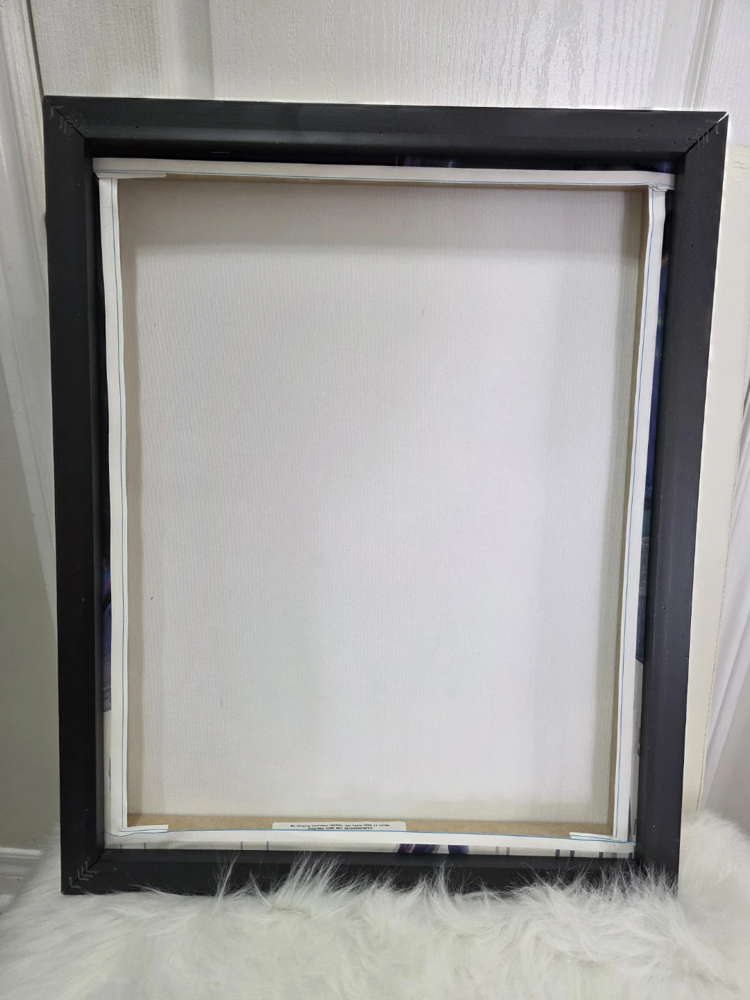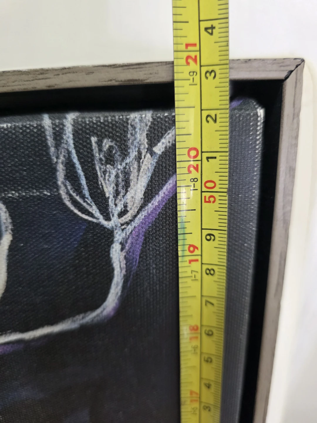 This framed canvas art features an abstract floral design with bold blues and purples. It measures approximately 20 inches by 16 inches. Adds a splash of colour to any room!