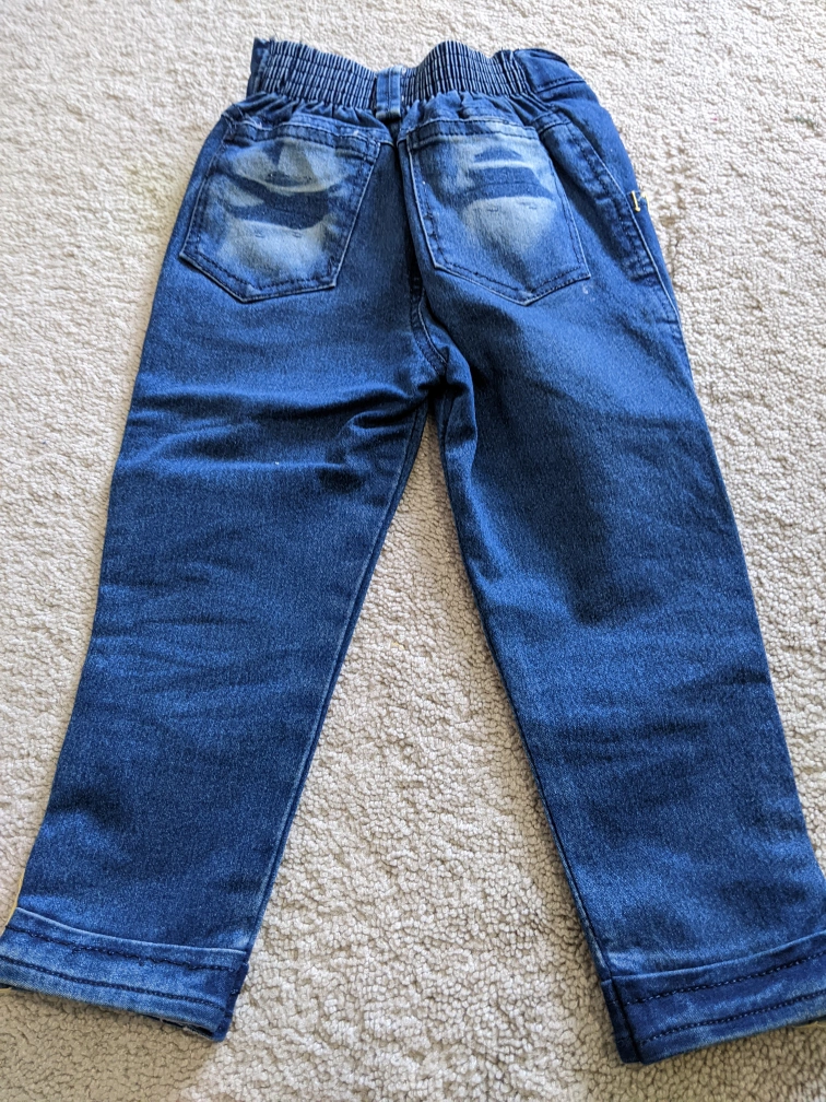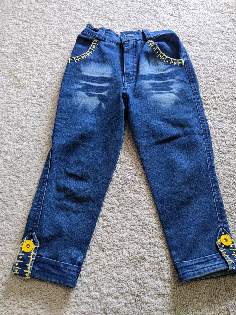 Girls Blue denim jeans with yellow threads and buttons. It is very soft and you can wear it in any weather, mostly suitable for spring, fall and summer. Size is 3-5 years old but may fit since 6 year olds. Only worn once, new and good condition. Payment is cash only and pickup only please buy!